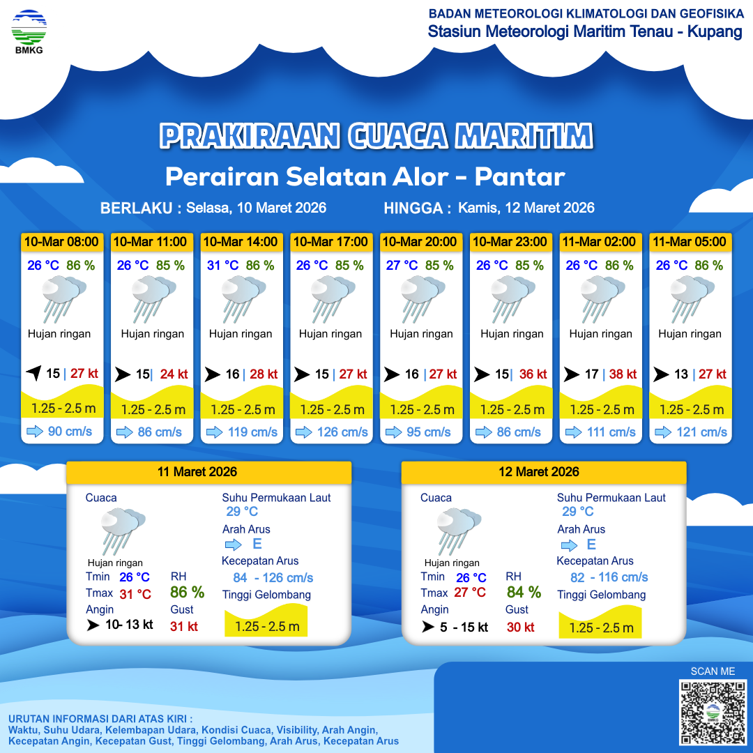 10 Mar 26, 16.00 2 jam kedepan | Barat 15 kt Gust Peningkatan kecepatan angin yang singkat dan tiba-tiba : 37 kt | 1.9 m Sedang | Timur 93.0 cm/s | 26 °C | 86 % | |