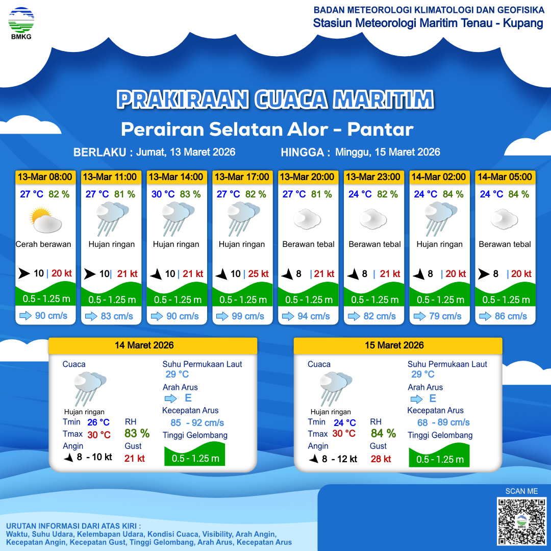 13 Mar 26, 11.00 2 jam kedepan | Barat Laut 10 kt Gust Peningkatan kecepatan angin yang singkat dan tiba-tiba : 24 kt | 1.1 m Rendah | Timur 97.0 cm/s | 27 °C | 81 % | |