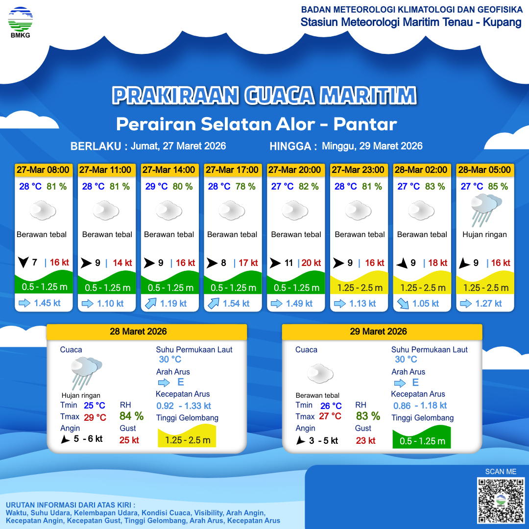 27 Mar 26, 23.00 6 jam kedepan | Timur 10 kt Gust Peningkatan kecepatan angin yang singkat dan tiba-tiba : 15 kt | 1.3 m Sedang | Timur 1.4 Knots | 27 °C | 83 % |