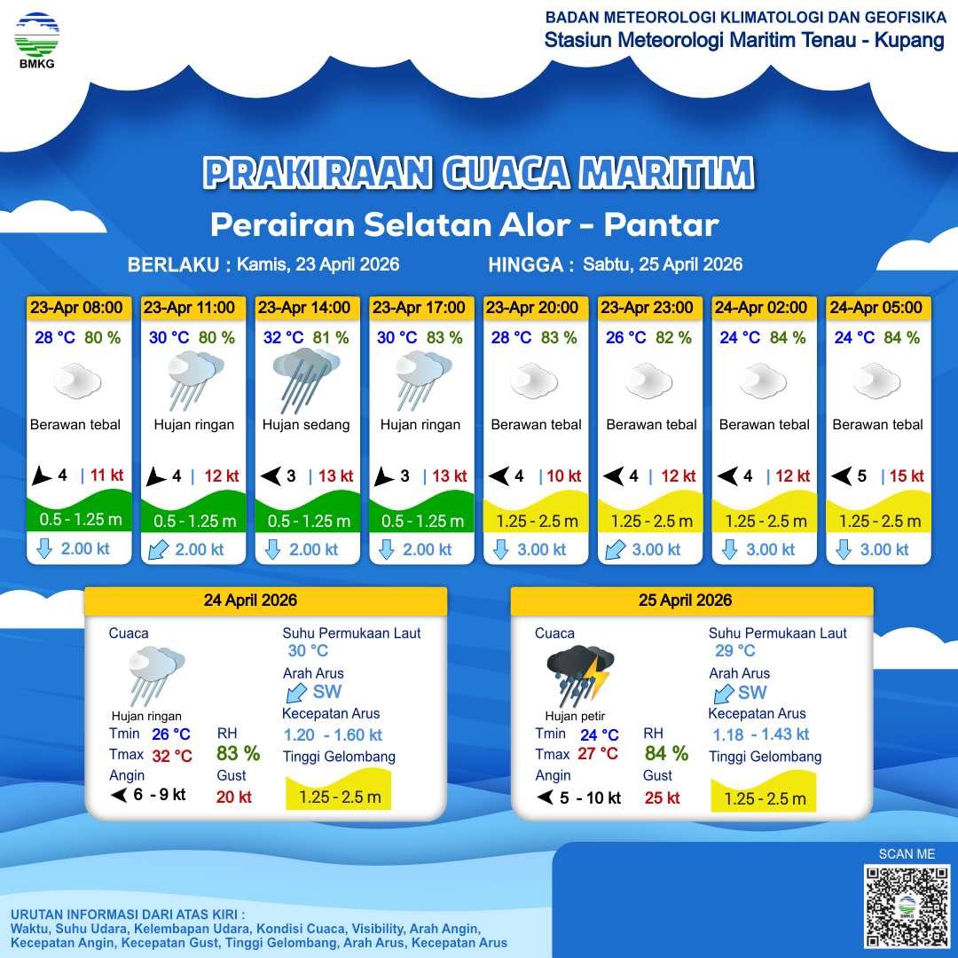 23 Apr 26, 06.00 4 jam kedepan | Timur 3 kt Gust Peningkatan kecepatan angin yang singkat dan tiba-tiba : 7 kt | 1.2 m Rendah | Selatan 2.0 Knots | 32 °C | 81 % | |
