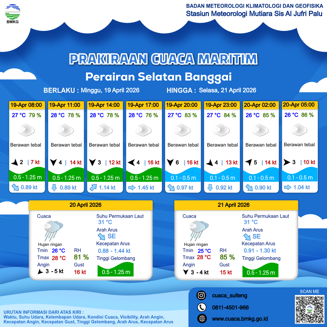 20 Apr 26, 06.00 19 jam kedepan | Timur 4 kt Gust Peningkatan kecepatan angin yang singkat dan tiba-tiba : 16 kt | 0.5 m Rendah | Timur Laut 1.1 Knots | 28 °C | 80 % | |