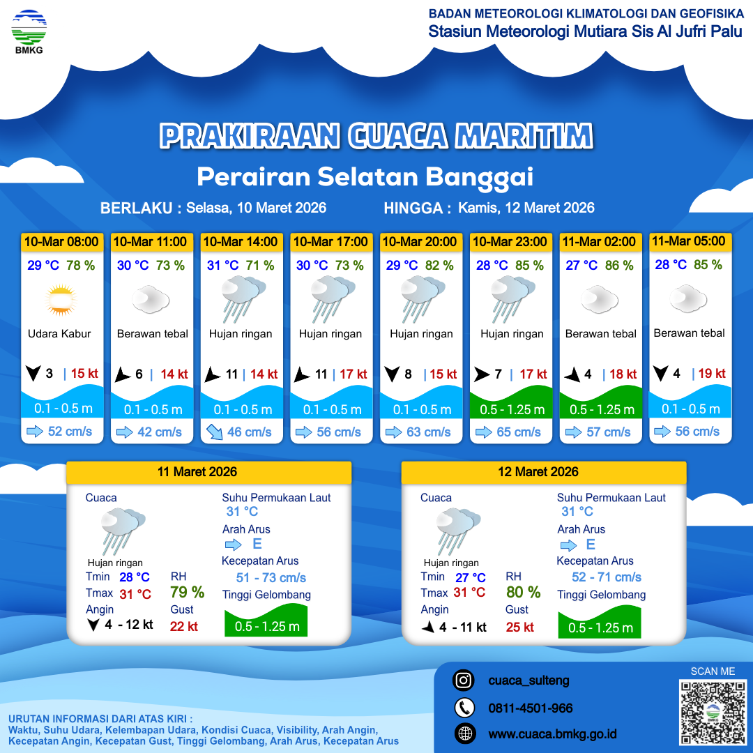 10 Mar 26, 06.00 7 jam kedepan | Timur Laut 11 kt Gust Peningkatan kecepatan angin yang singkat dan tiba-tiba : 14 kt | 0.5 m Rendah | Tenggara 46.0 cm/s | 31 °C | 71 % | |