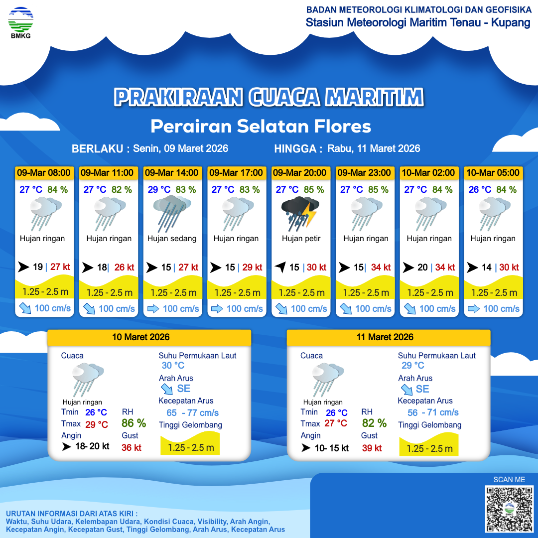 9 Mar 26, 22.00 3 jam kedepan | Hujan Ringan | Barat 14 kt Gust Peningkatan kecepatan angin yang singkat dan tiba-tiba : 30 kt | | | 26 °C | 85 % |