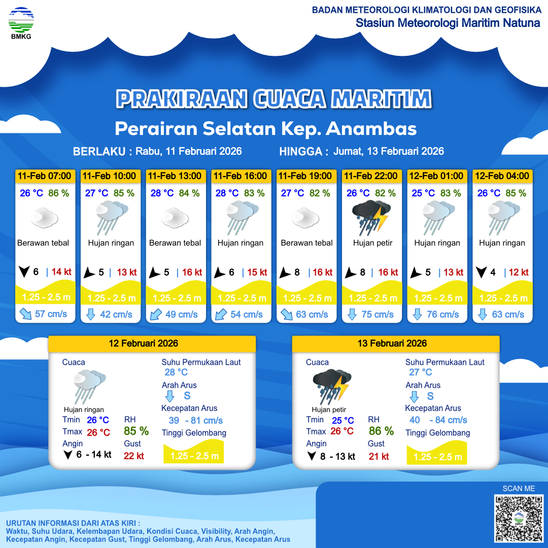 10 Feb 26, 17.00 2 jam kedepan | Utara 7 kt Gust Peningkatan kecepatan angin yang singkat dan tiba-tiba : 14 kt | 1.8 m Sedang | Selatan 74.0 cm/s | 26 °C | 86 % | |