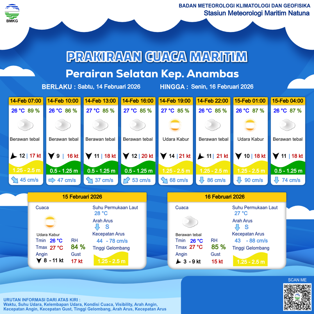 14 Feb 26, 20.00 4 jam kedepan | Utara 11 kt Gust Peningkatan kecepatan angin yang singkat dan tiba-tiba : 18 kt | 1.3 m Sedang | Selatan 81.0 cm/s | 26 °C | 87 % | |