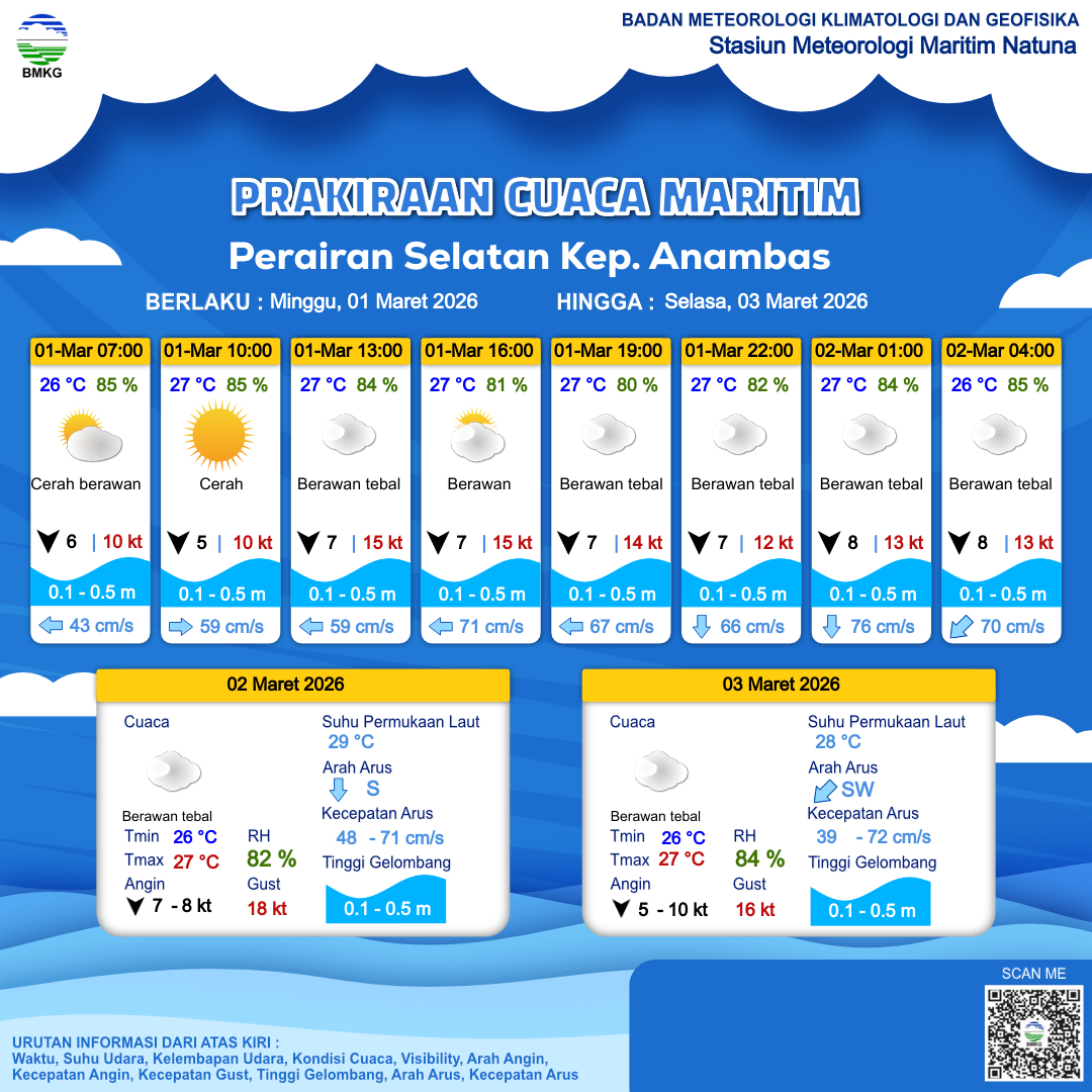 1 Mar 26, 21.00 2 jam kedepan | Berawan Tebal | Utara 8 kt Gust Peningkatan kecepatan angin yang singkat dan tiba-tiba : 13 kt | | | 26 °C | 85 % |