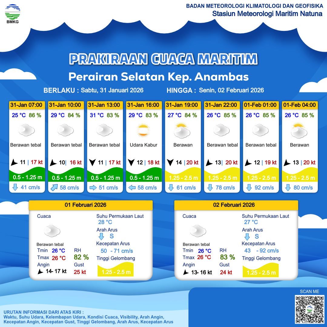 31 Jan 26, 16.00 2 jam kedepan | Timur Laut 13 kt Gust Peningkatan kecepatan angin yang singkat dan tiba-tiba : 19 kt | 1.4 m Sedang | Selatan 86.0 cm/s | 26 °C | 84 % | |