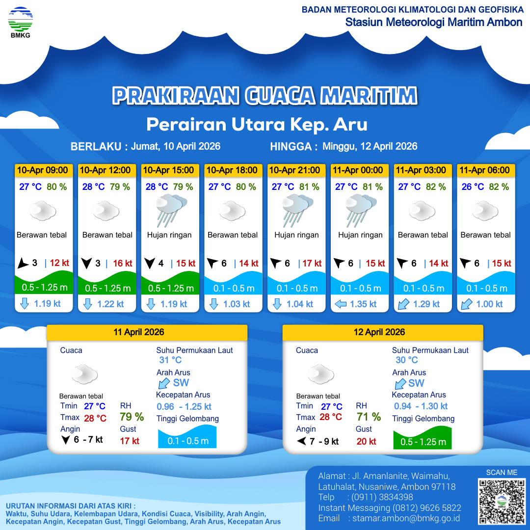 10 Apr 26, 13.00 2 jam kedepan | Tenggara 8 kt Gust Peningkatan kecepatan angin yang singkat dan tiba-tiba : 14 kt | 0.5 m Rendah | Barat 1.0 Knots | 28 °C | 76 % | |