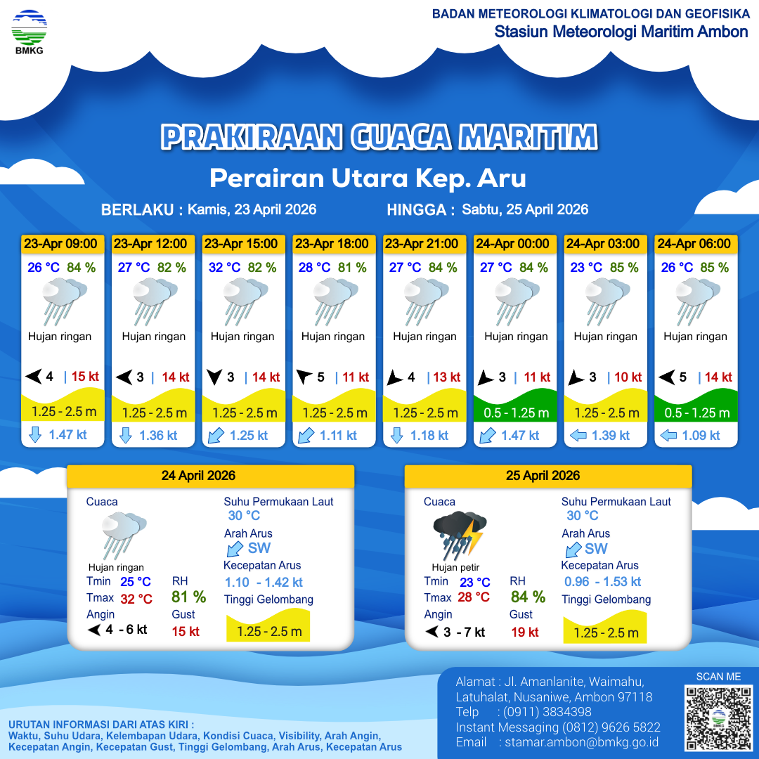 23 Apr 26, 00.00 17 jam kedepan | Timur 7 kt Gust Peningkatan kecepatan angin yang singkat dan tiba-tiba : 16 kt | 1.7 m Sedang | Selatan 1.5 Knots | 27 °C | 85 % | |