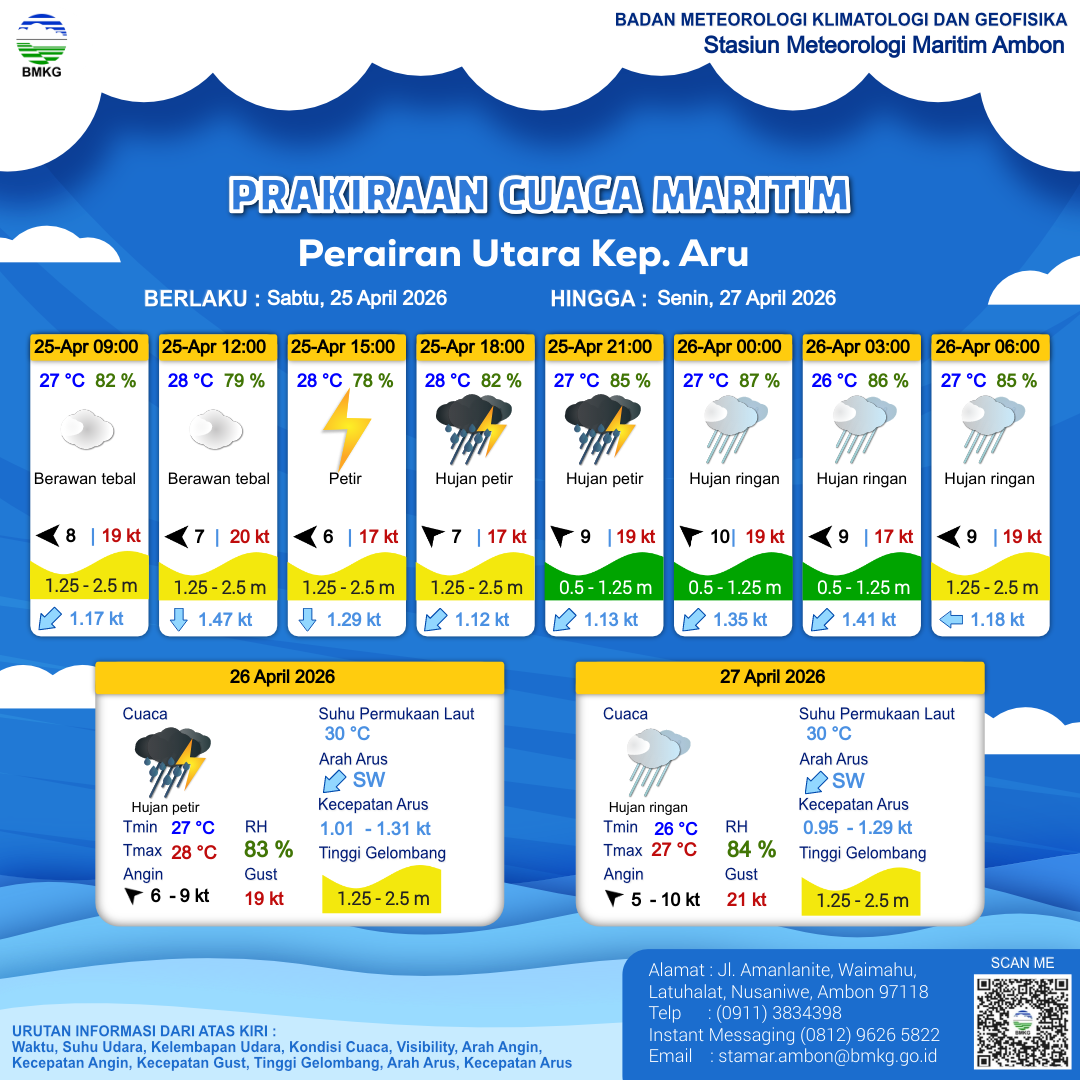 24 Apr 26, 18.00 6 jam kedepan | Timur 9 kt Gust Peningkatan kecepatan angin yang singkat dan tiba-tiba : 19 kt | 1.5 m Sedang | Barat 1.7 Knots | 26 °C | 87 % | |