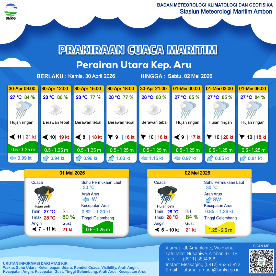 29 Apr 26, 15.00 2 jam kedepan | Tenggara 14 kt Gust Peningkatan kecepatan angin yang singkat dan tiba-tiba : 23 kt | 1.1 m Rendah | Barat 1.1 Knots | 28 °C | 77 % | |