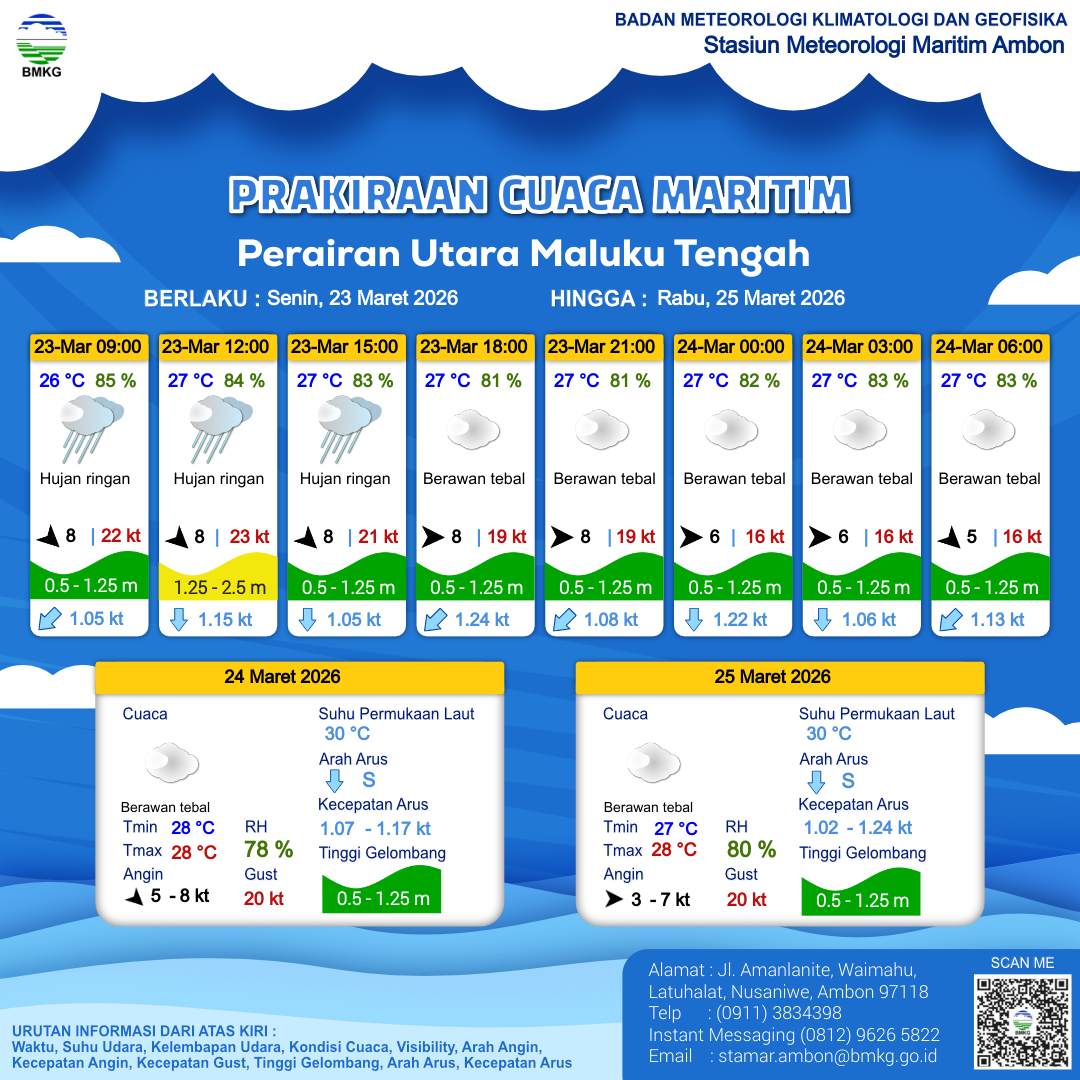 23 Mar 26, 19.00 2 jam kedepan | Utara 5 kt Gust Peningkatan kecepatan angin yang singkat dan tiba-tiba : 19 kt | 0.6 m Rendah | Selatan 0.8 Knots | 27 °C | 83 % | |