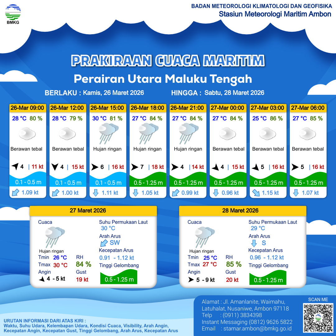 26 Mar 26, 22.00 3 jam kedepan | Hujan Ringan | Barat 8 kt Gust Peningkatan kecepatan angin yang singkat dan tiba-tiba : 20 kt | | | 26 °C | 86 % |