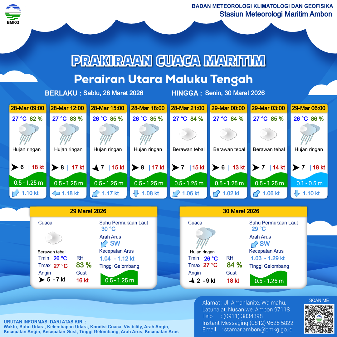 28 Mar 26, 16.00 2 jam kedepan | Barat 5 kt Gust Peningkatan kecepatan angin yang singkat dan tiba-tiba : 10 kt | 0.3 m Tenang | Tenggara 0.8 Knots | 27 °C | 84 % | |