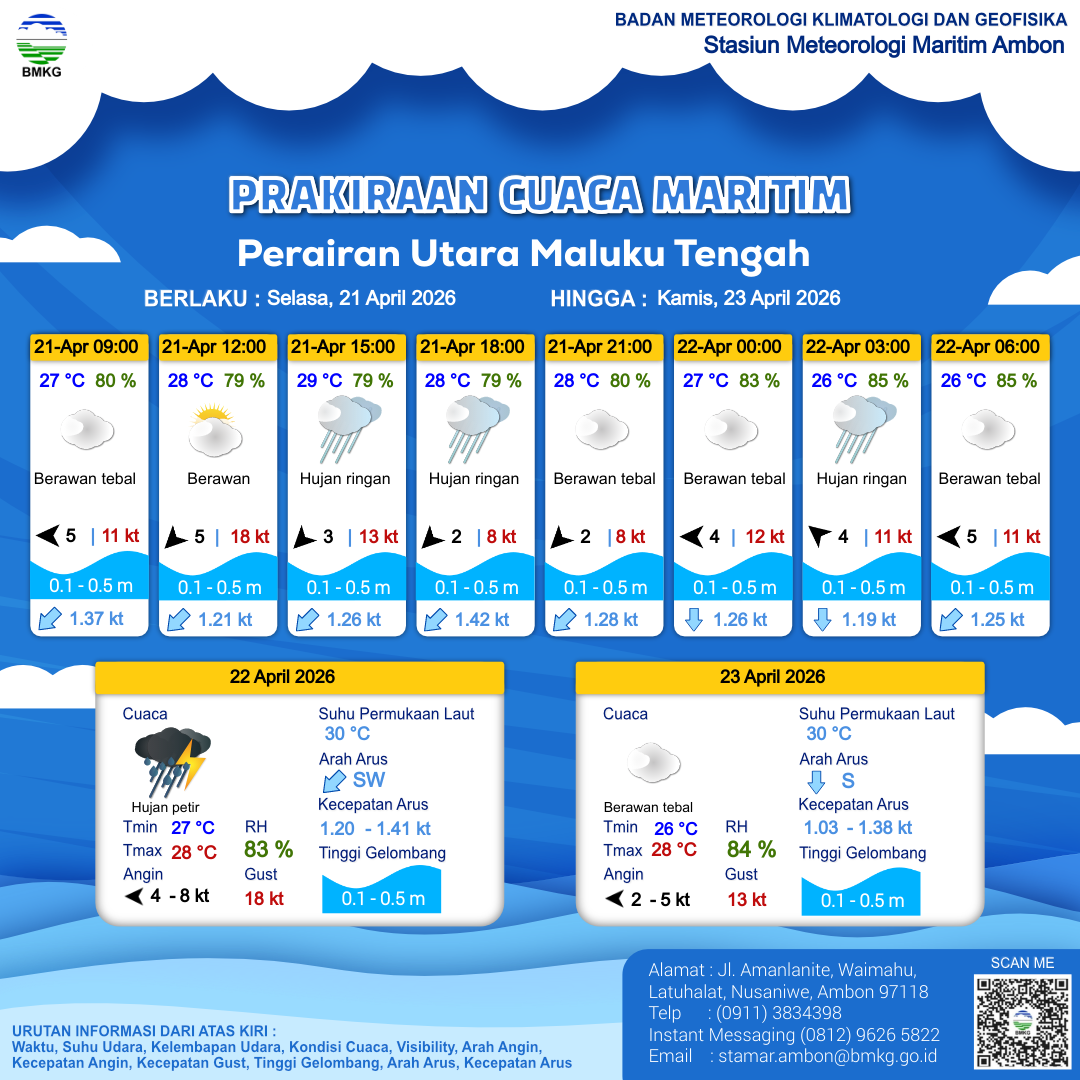 21 Apr 26, 06.00 11 jam kedepan | Timur 4 kt Gust Peningkatan kecepatan angin yang singkat dan tiba-tiba : 13 kt | 0.4 m Tenang | Tenggara 0.9 Knots | 28 °C | 80 % | |