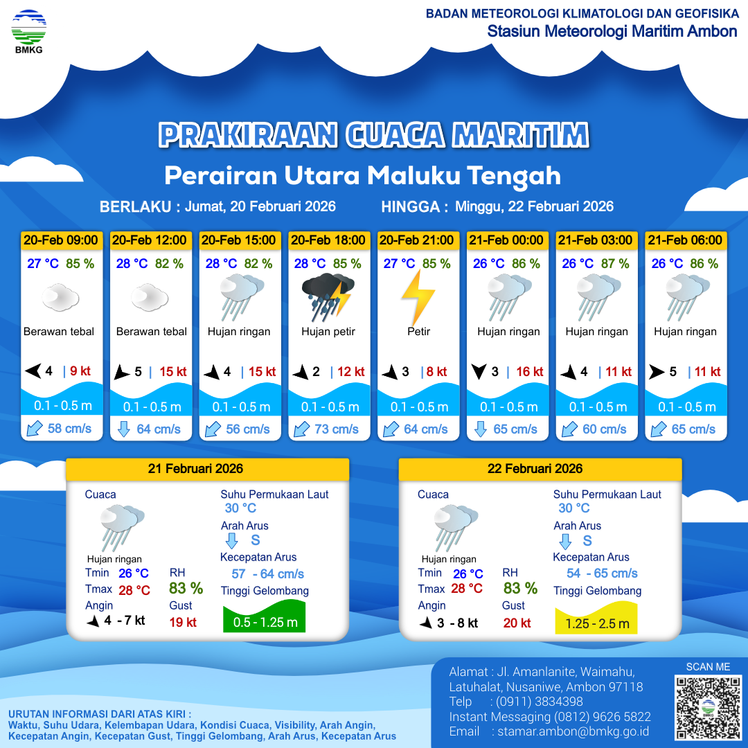 20 Feb 26, 15.00 4 jam kedepan | Utara 4 kt Gust Peningkatan kecepatan angin yang singkat dan tiba-tiba : 12 kt | 0.4 m Tenang | Timur 42.0 cm/s | 28 °C | 80 % | |