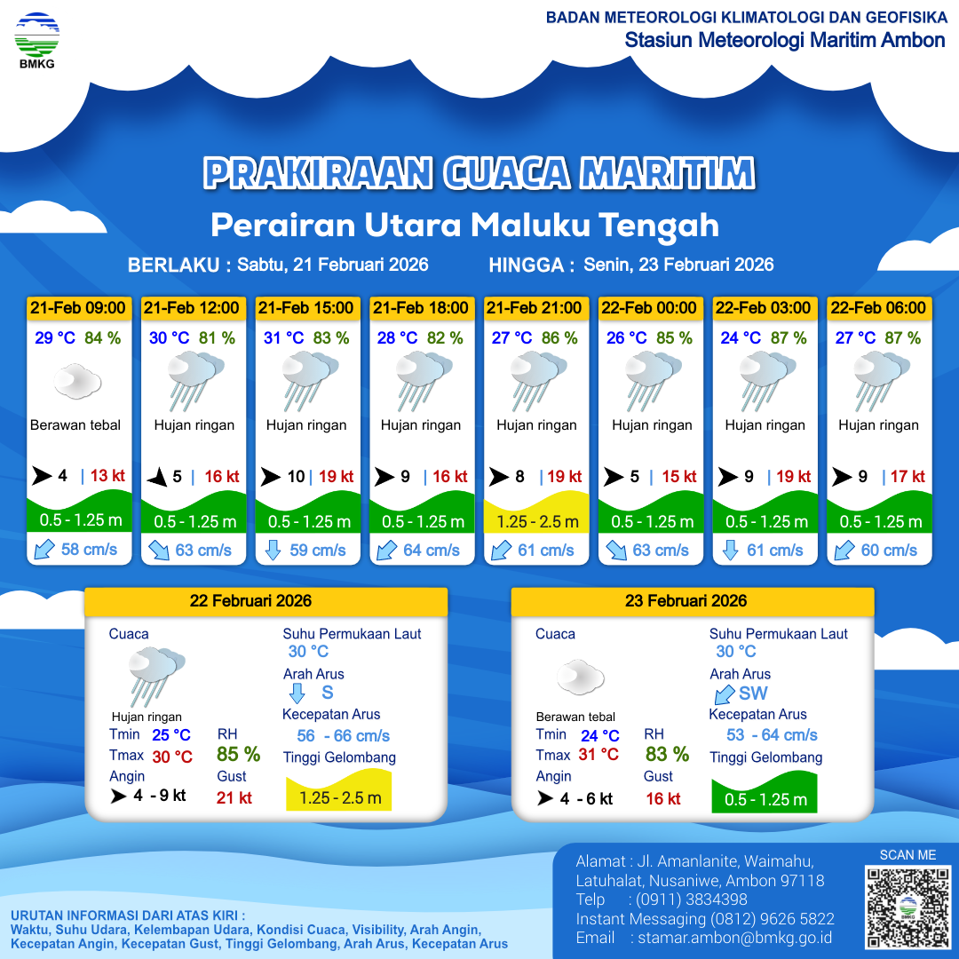 21 Feb 26, 08.00 3 jam kedepan | Barat Laut 4 kt Gust Peningkatan kecepatan angin yang singkat dan tiba-tiba : 20 kt | 1 m Rendah | Selatan 44.0 cm/s | 29 °C | 84 % | |