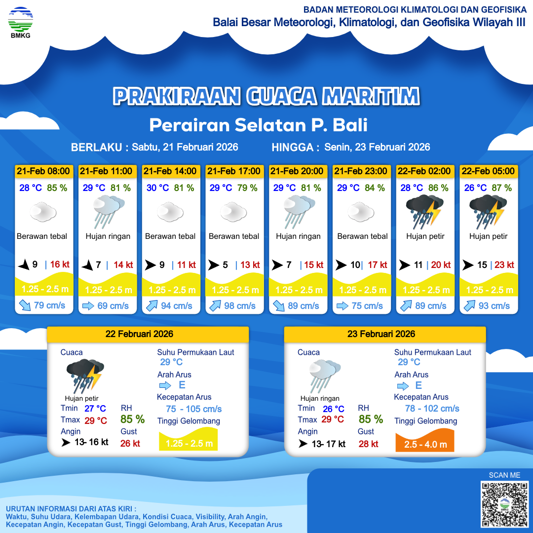 21 Feb 26, 21.00 4 jam kedepan | Barat 15 kt Gust Peningkatan kecepatan angin yang singkat dan tiba-tiba : 23 kt | 1.9 m Sedang | Timur Laut 93.0 cm/s | 26 °C | 87 % | |