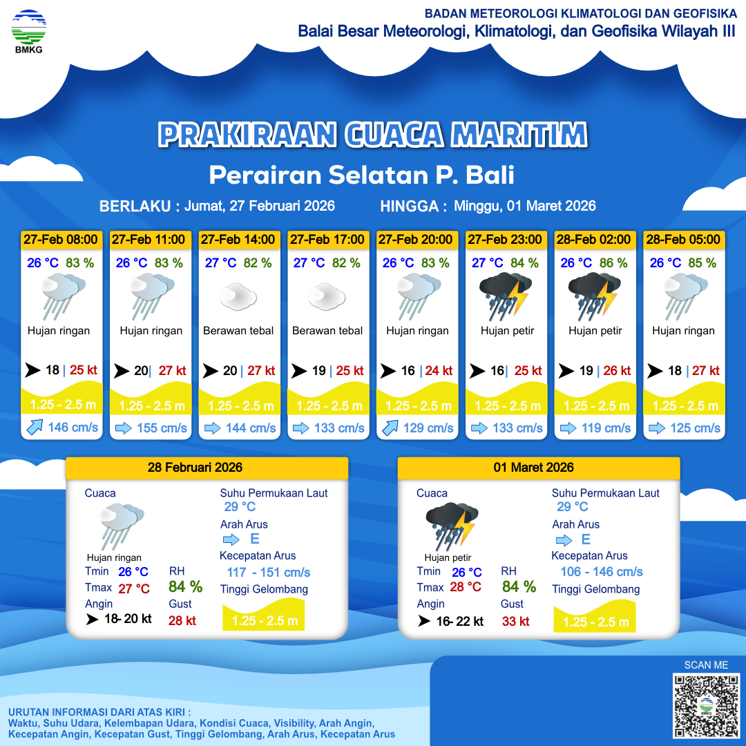 27 Feb 26, 22.00 2 jam kedepan | Hujan Ringan | Barat 18 kt Gust Peningkatan kecepatan angin yang singkat dan tiba-tiba : 27 kt | | | 26 °C | 86 % |