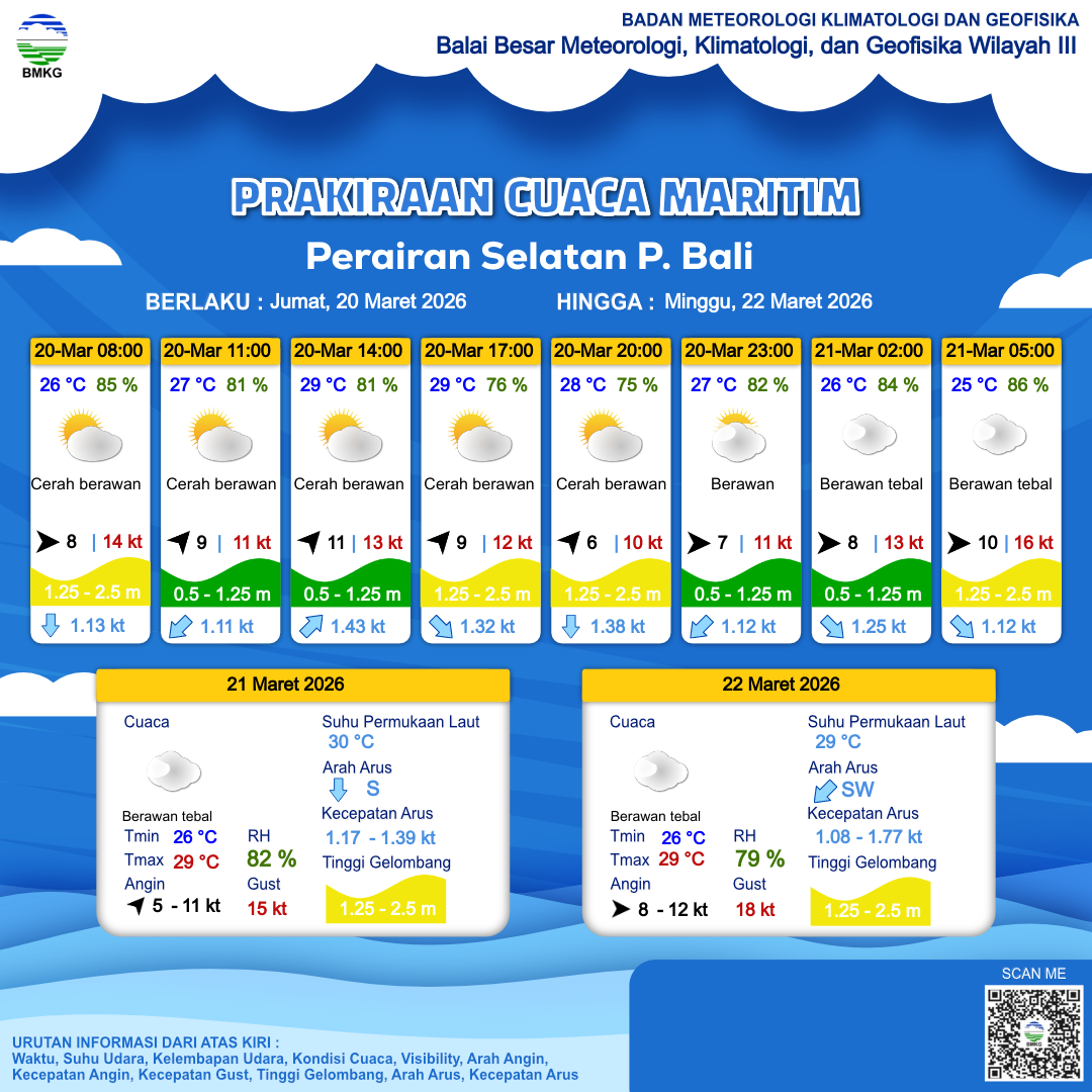 20 Mar 26, 14.00 2 jam kedepan | Barat 7 kt Gust Peningkatan kecepatan angin yang singkat dan tiba-tiba : 11 kt | 1.3 m Sedang | Barat 1.1 Knots | 27 °C | 79 % | |