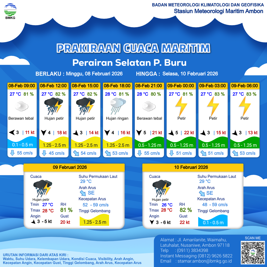 7 Feb 26, 23.00 4 jam kedepan | Hujan Ringan | Barat Laut 5 kt Gust Peningkatan kecepatan angin yang singkat dan tiba-tiba : 16 kt | | | 27 °C | 83 % |