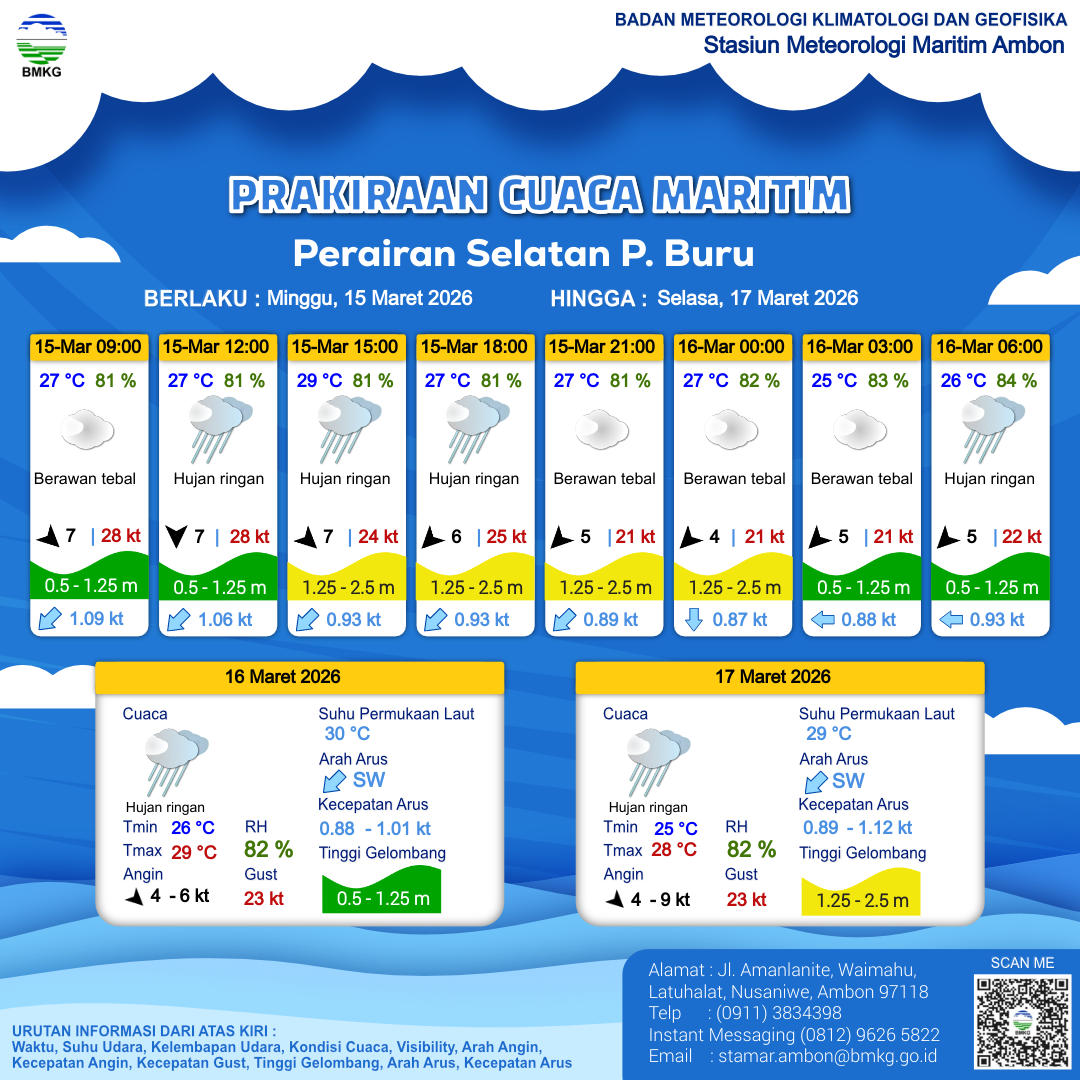 14 Mar 26, 23.00 3 jam kedepan | Berawan Tebal | Utara 5 kt Gust Peningkatan kecepatan angin yang singkat dan tiba-tiba : 28 kt | | | 27 °C | 82 % |