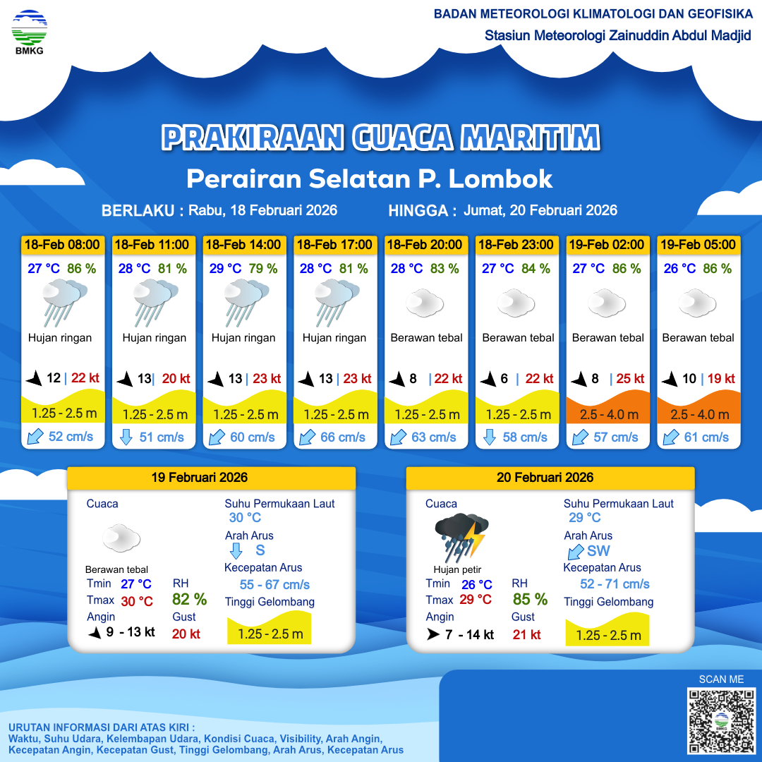 18 Feb 26, 23.00 4 jam kedepan | Berawan Tebal | Barat Laut 9 kt Gust Peningkatan kecepatan angin yang singkat dan tiba-tiba : 17 kt | | | 27 °C | 86 % |