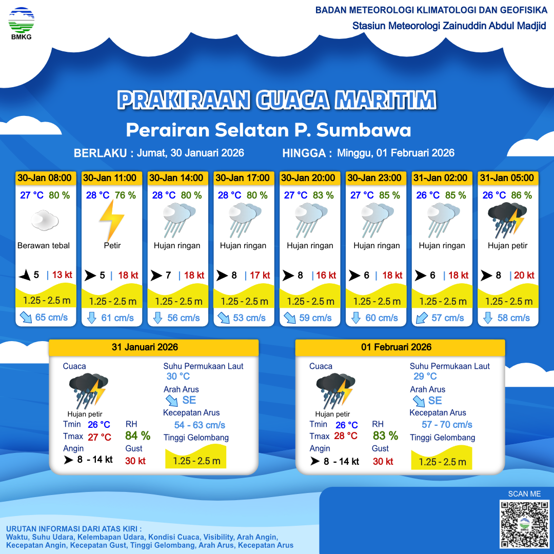 30 Jan 26, 16.00 4 jam kedepan | Barat 6 kt Gust Peningkatan kecepatan angin yang singkat dan tiba-tiba : 18 kt | 2.2 m Sedang | Selatan 57.0 cm/s | 27 °C | 85 % | |