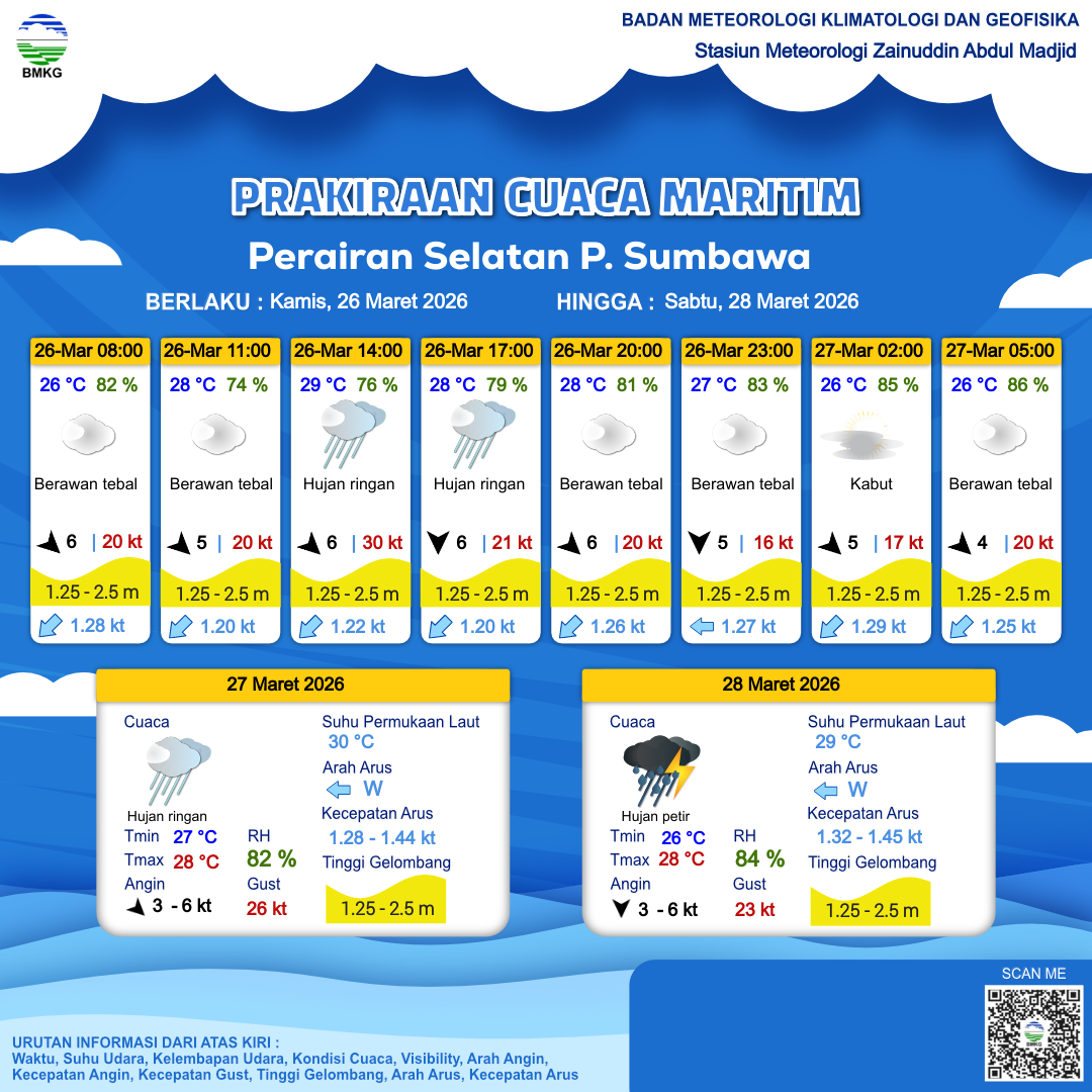 26 Mar 26, 15.00 3 jam kedepan | Utara 5 kt Gust Peningkatan kecepatan angin yang singkat dan tiba-tiba : 16 kt | 1.6 m Sedang | Barat 1.3 Knots | 27 °C | 83 % | |