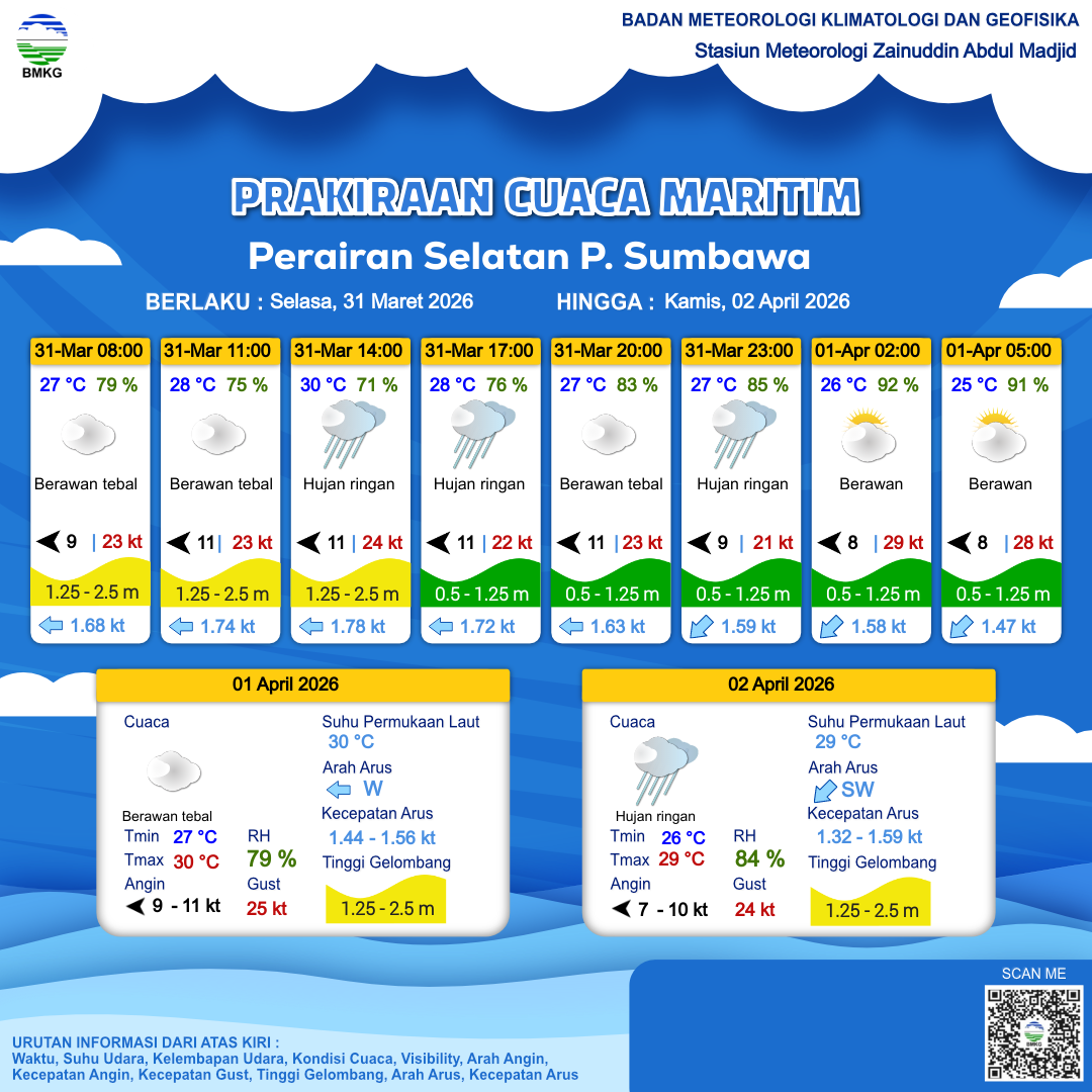 31 Mar 26, 11.00 4 jam kedepan | Timur 11 kt Gust Peningkatan kecepatan angin yang singkat dan tiba-tiba : 21 kt | 1.2 m Rendah | Barat 1.7 Knots | 28 °C | 80 % | |
