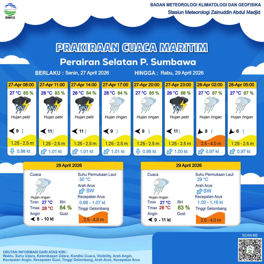 28 Apr 26, 13.00 4 jam kedepan | Timur 9 kt Gust Peningkatan kecepatan angin yang singkat dan tiba-tiba : 27 kt | 2.5 m Tinggi | Barat Daya 1.0 Knots | 28 °C | 84 % | |