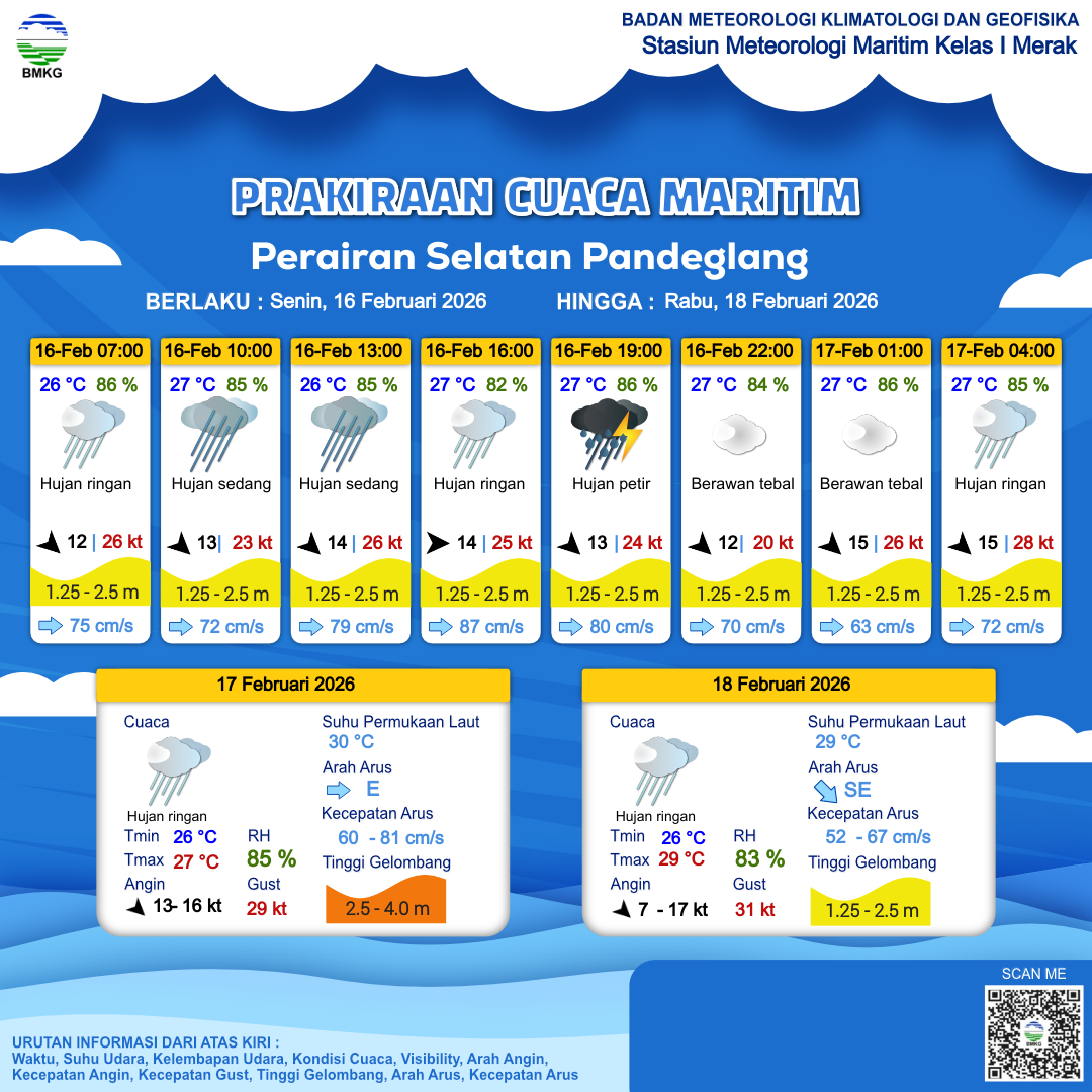 16 Feb 26, 09.00 3 jam kedepan | Barat 14 kt Gust Peningkatan kecepatan angin yang singkat dan tiba-tiba : 25 kt | 2.2 m Sedang | Timur 87.0 cm/s | 27 °C | 82 % | |