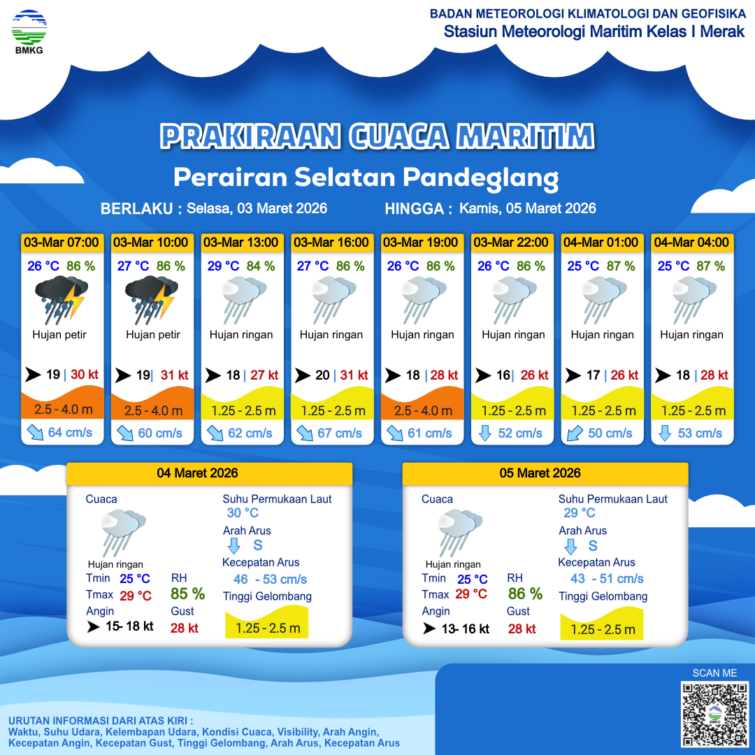 2 Mar 26, 05.00 4 jam kedepan | Barat Laut 22 kt Gust Peningkatan kecepatan angin yang singkat dan tiba-tiba : 31 kt | 1.5 m Sedang | Tenggara 61.0 cm/s | 29 °C | 81 % | |