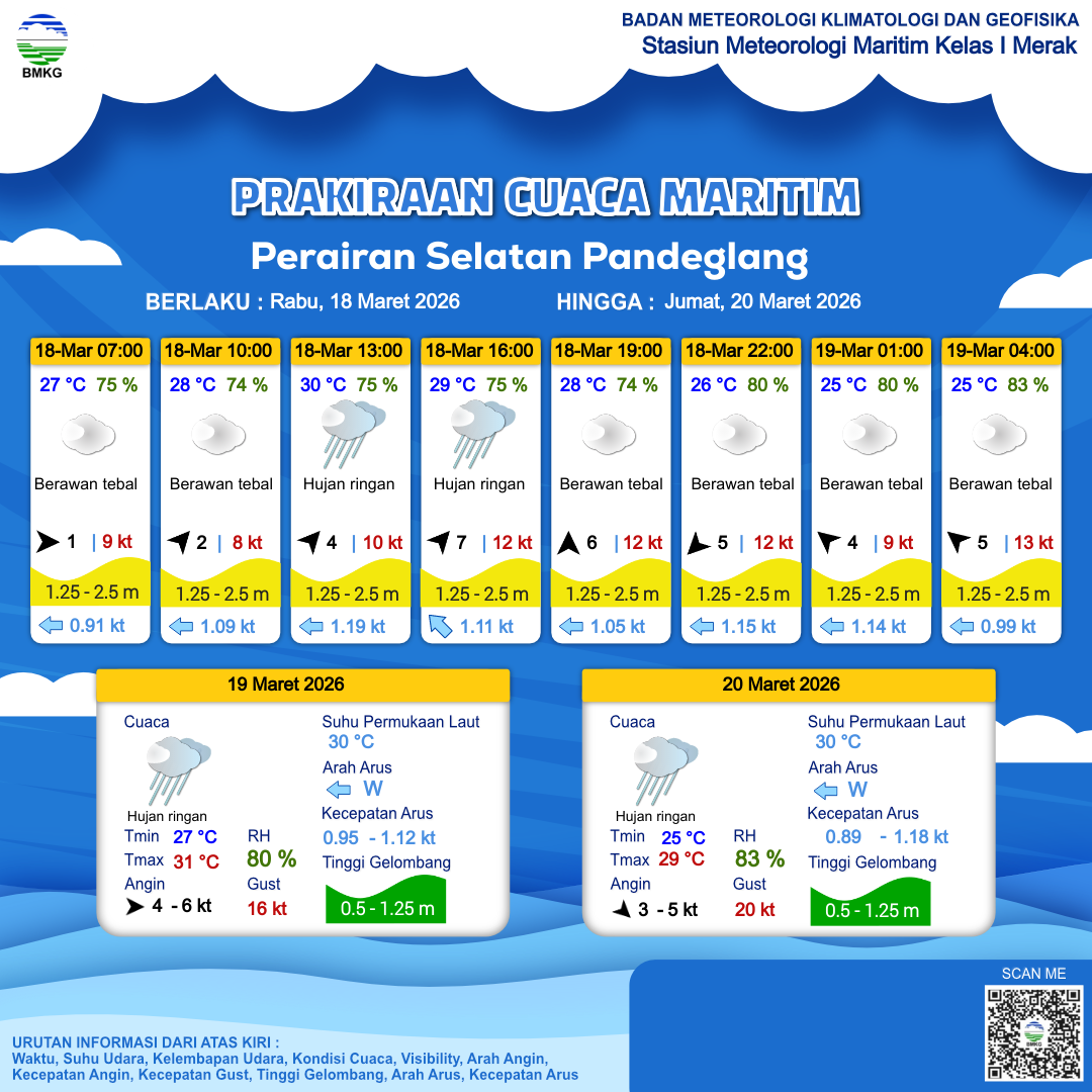 17 Mar 26, 07.00 6 jam kedepan | Barat 8 kt Gust Peningkatan kecepatan angin yang singkat dan tiba-tiba : 14 kt | 1.5 m Sedang | Barat 0.9 Knots | 32 °C | 69 % | |
