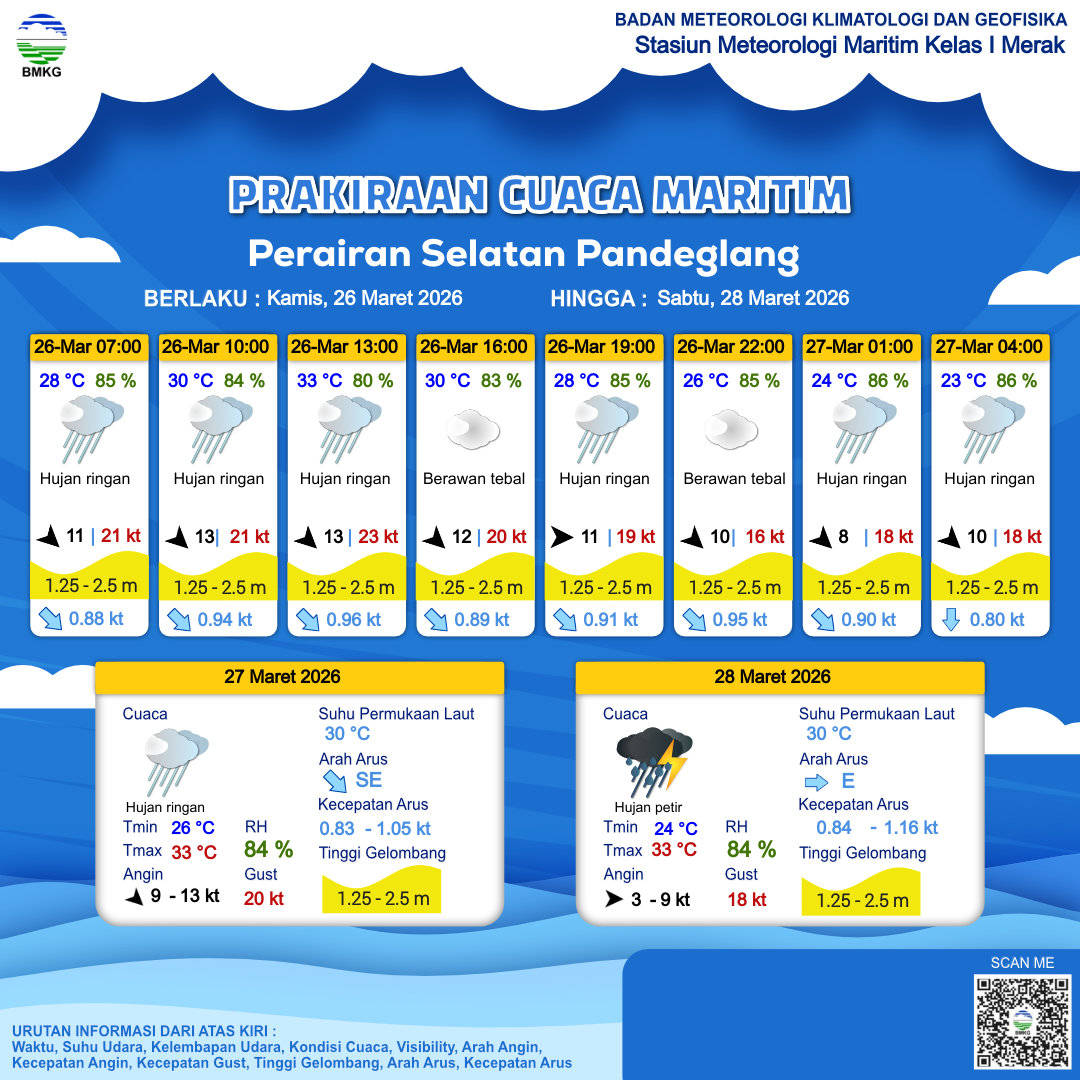 26 Mar 26, 15.00 3 jam kedepan | Barat Laut 10 kt Gust Peningkatan kecepatan angin yang singkat dan tiba-tiba : 16 kt | 1.7 m Sedang | Tenggara 0.9 Knots | 26 °C | 85 % | |