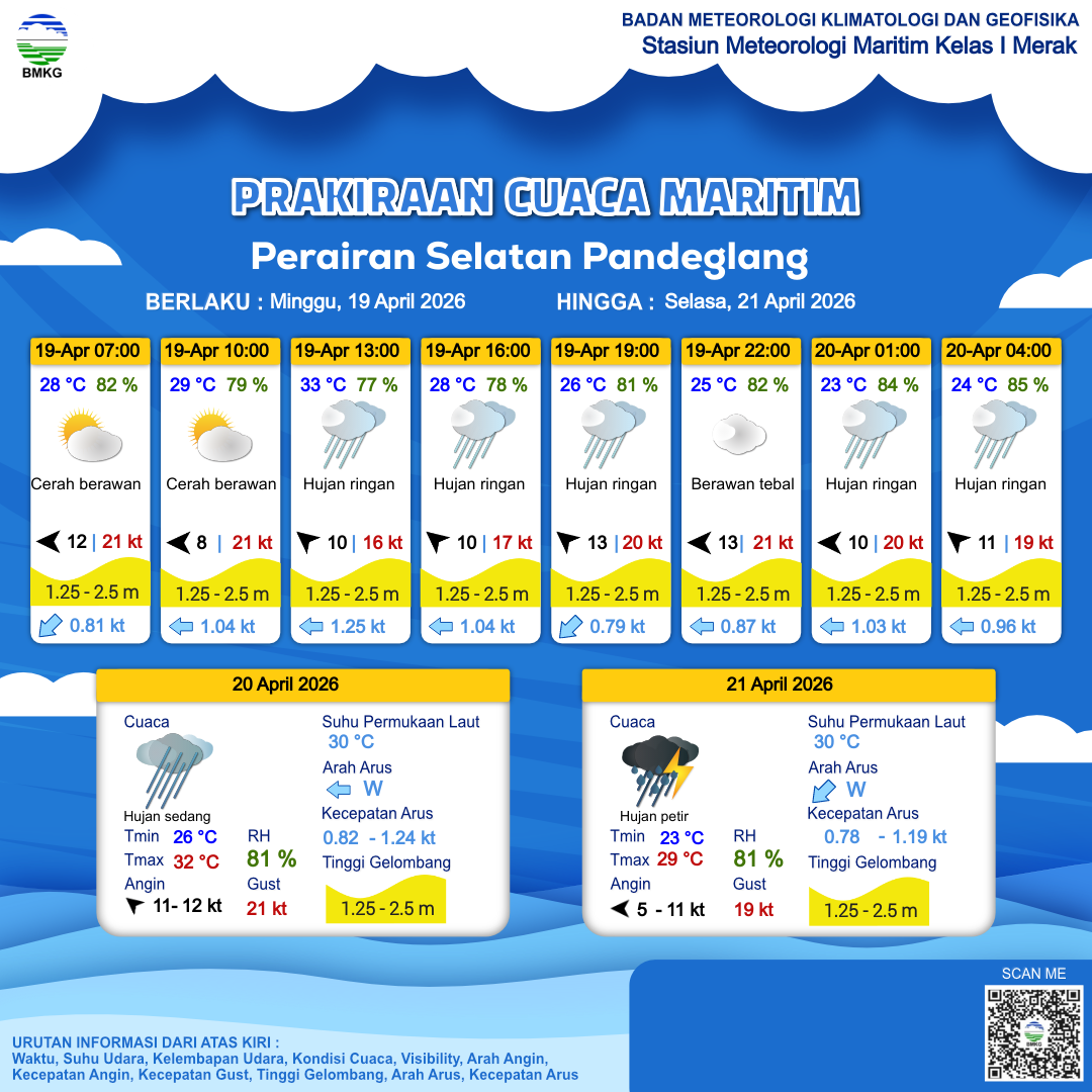 19 Apr 26, 11.00 2 jam kedepan | Tenggara 13 kt Gust Peningkatan kecepatan angin yang singkat dan tiba-tiba : 20 kt | 1.9 m Sedang | Barat 0.8 Knots | 27 °C | 80 % | |