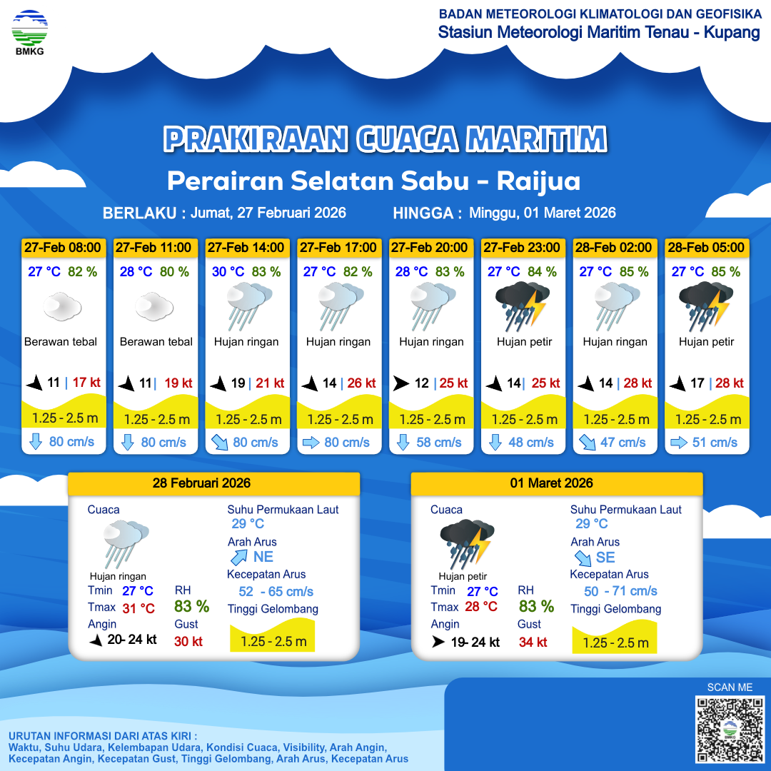 27 Feb 26, 22.00 2 jam kedepan | Petir | Barat Laut 17 kt Gust Peningkatan kecepatan angin yang singkat dan tiba-tiba : 28 kt | | | 27 °C | 85 % |