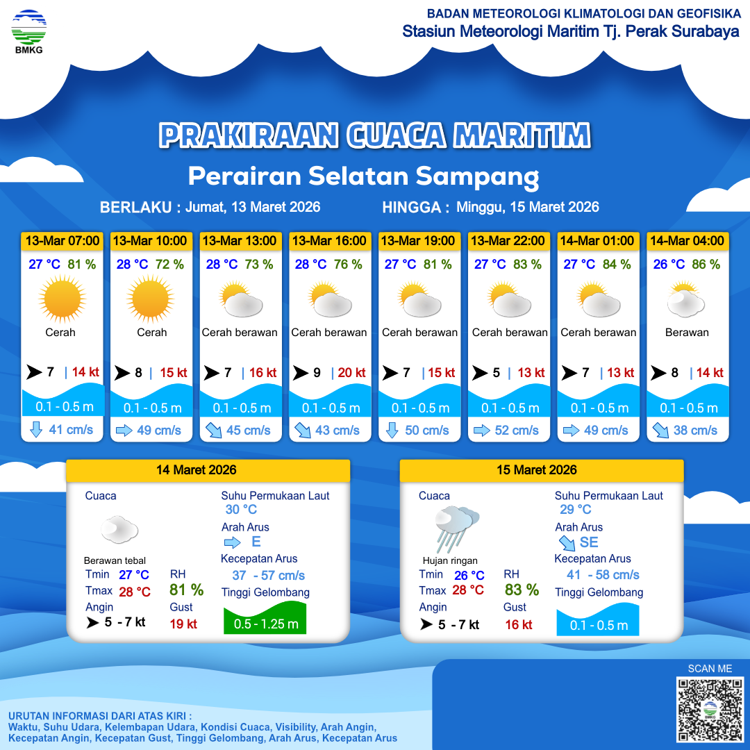 13 Mar 26, 16.00 3 jam kedepan | Barat 5 kt Gust Peningkatan kecepatan angin yang singkat dan tiba-tiba : 12 kt | 0.2 m Tenang | Timur 52.0 cm/s | 27 °C | 83 % | |