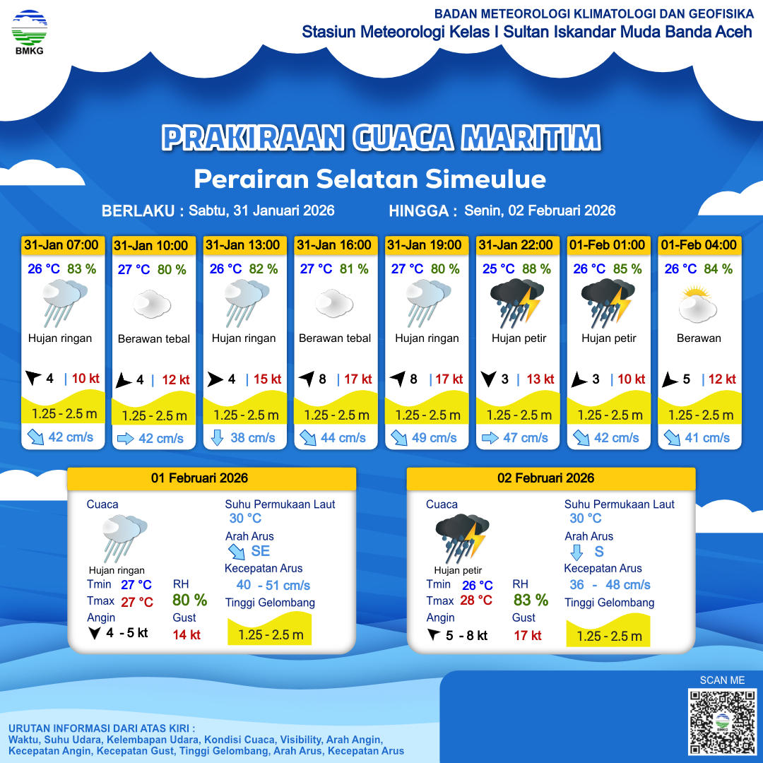 30 Jan 26, 23.00 2 jam kedepan | Hujan Petir | Utara 2 kt Gust Peningkatan kecepatan angin yang singkat dan tiba-tiba : 10 kt | | | 26 °C | 85 % |