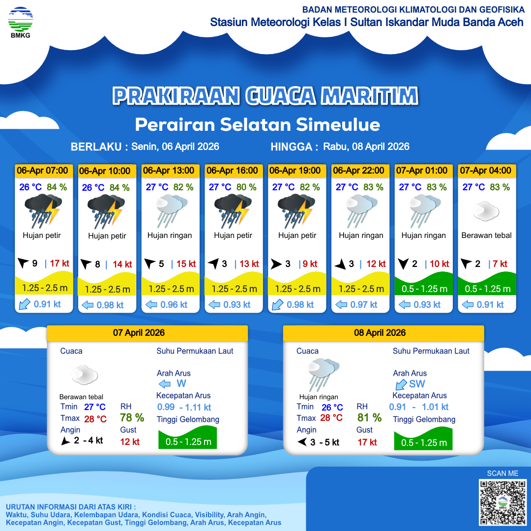 6 Apr 26, 03.00 3 jam kedepan | Tenggara 8 kt Gust Peningkatan kecepatan angin yang singkat dan tiba-tiba : 14 kt | 1.4 m Sedang | Barat 1.0 Knots | 26 °C | 84 % | |