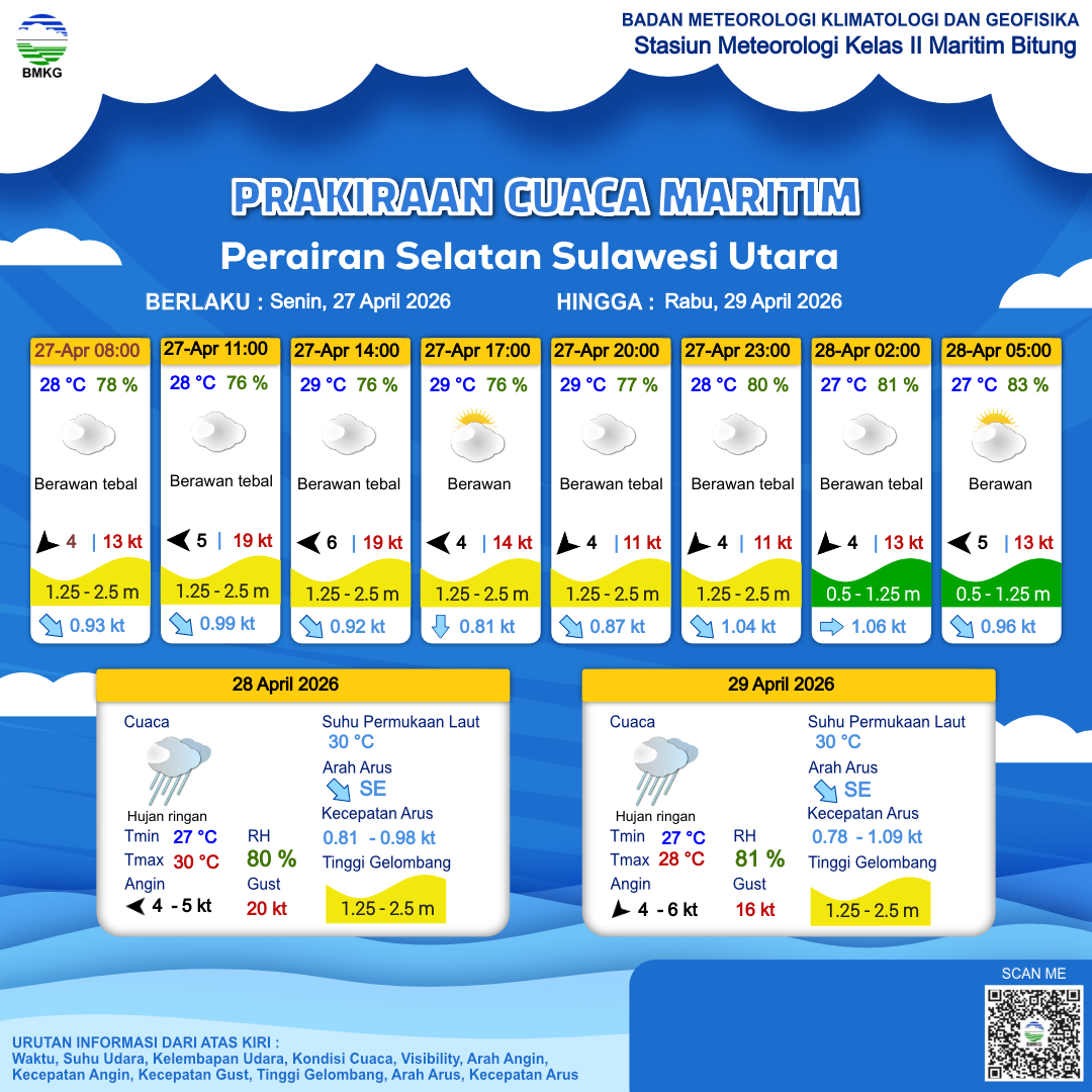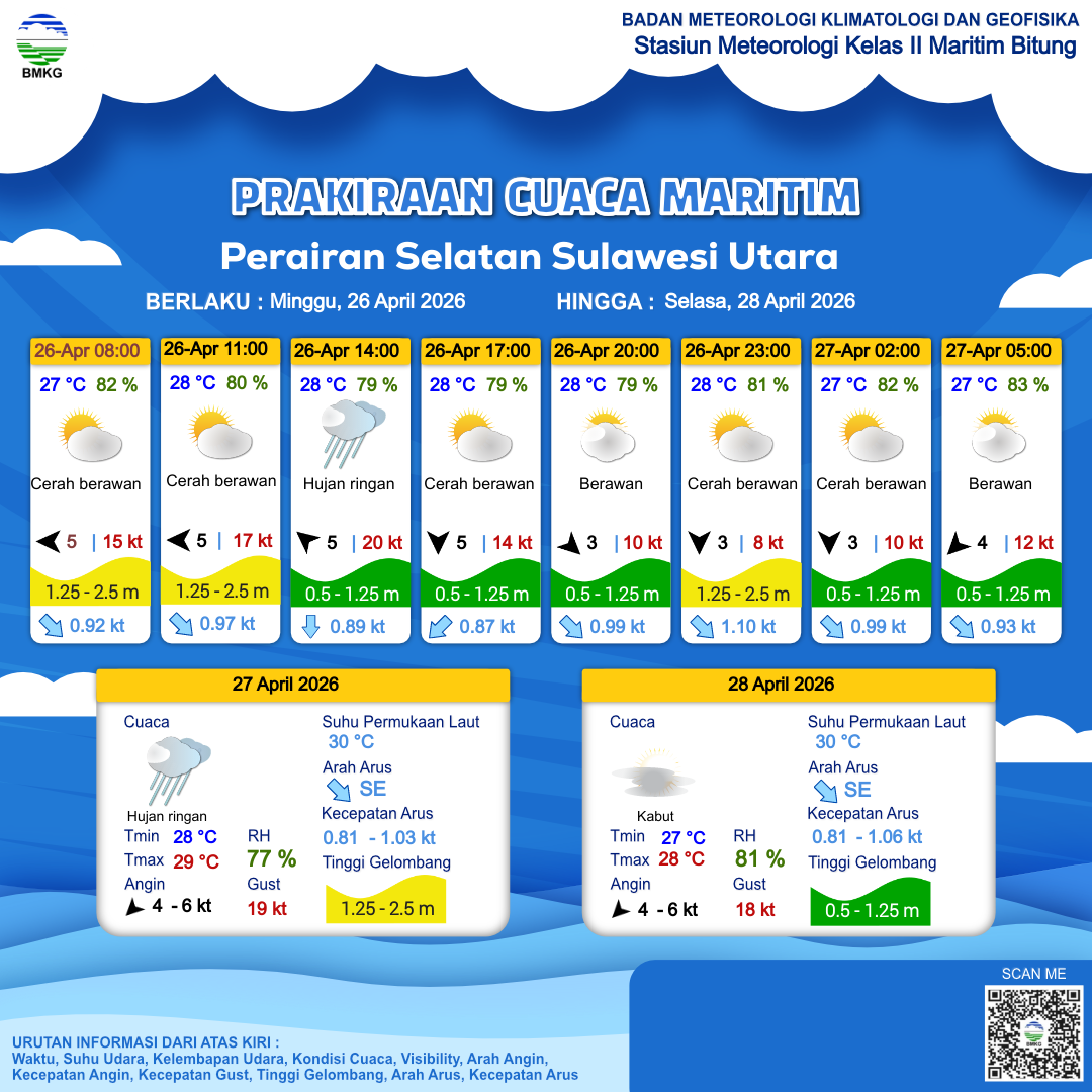 26 Apr 26, 06.00 4 jam kedepan | Tenggara 5 kt Gust Peningkatan kecepatan angin yang singkat dan tiba-tiba : 20 kt | 1.2 m Rendah | Selatan 0.9 Knots | 28 °C | 79 % | |
