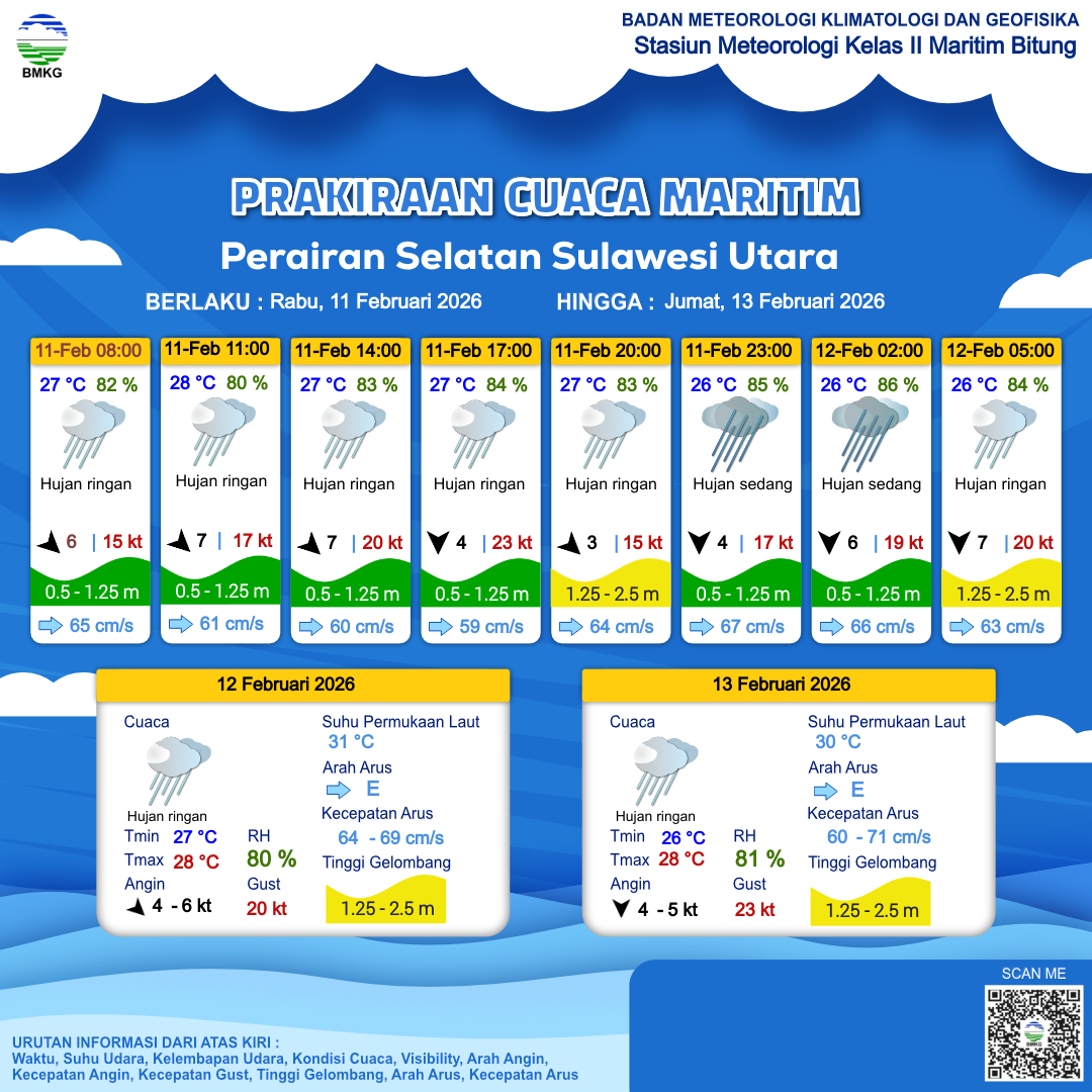 11 Feb 26, 14.00 6 jam kedepan | Utara 4 kt Gust Peningkatan kecepatan angin yang singkat dan tiba-tiba : 17 kt | 1.2 m Rendah | Timur 66.0 cm/s | 27 °C | 83 % | |