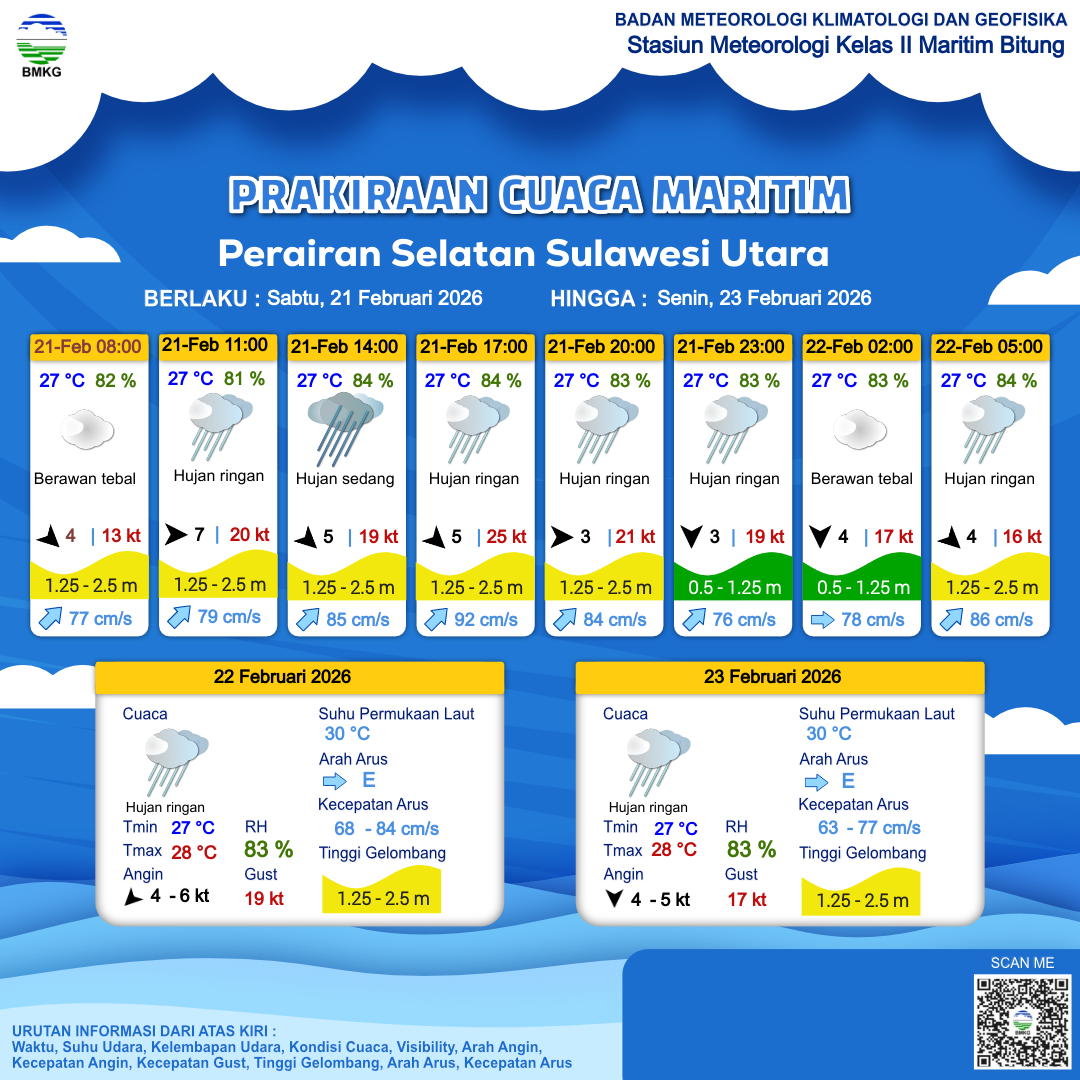 21 Feb 26, 04.00 2 jam kedepan | Barat 7 kt Gust Peningkatan kecepatan angin yang singkat dan tiba-tiba : 21 kt | 2.1 m Sedang | Timur Laut 80.0 cm/s | 27 °C | 85 % | |