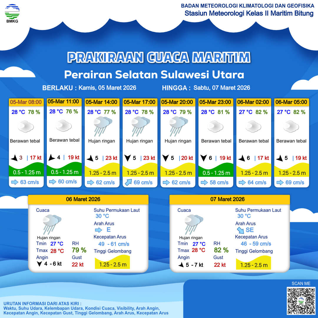 5 Mar 26, 23.00 2 jam kedepan | Berawan Tebal | Barat Laut 4 kt Gust Peningkatan kecepatan angin yang singkat dan tiba-tiba : 18 kt | | | 27 °C | 81 % |