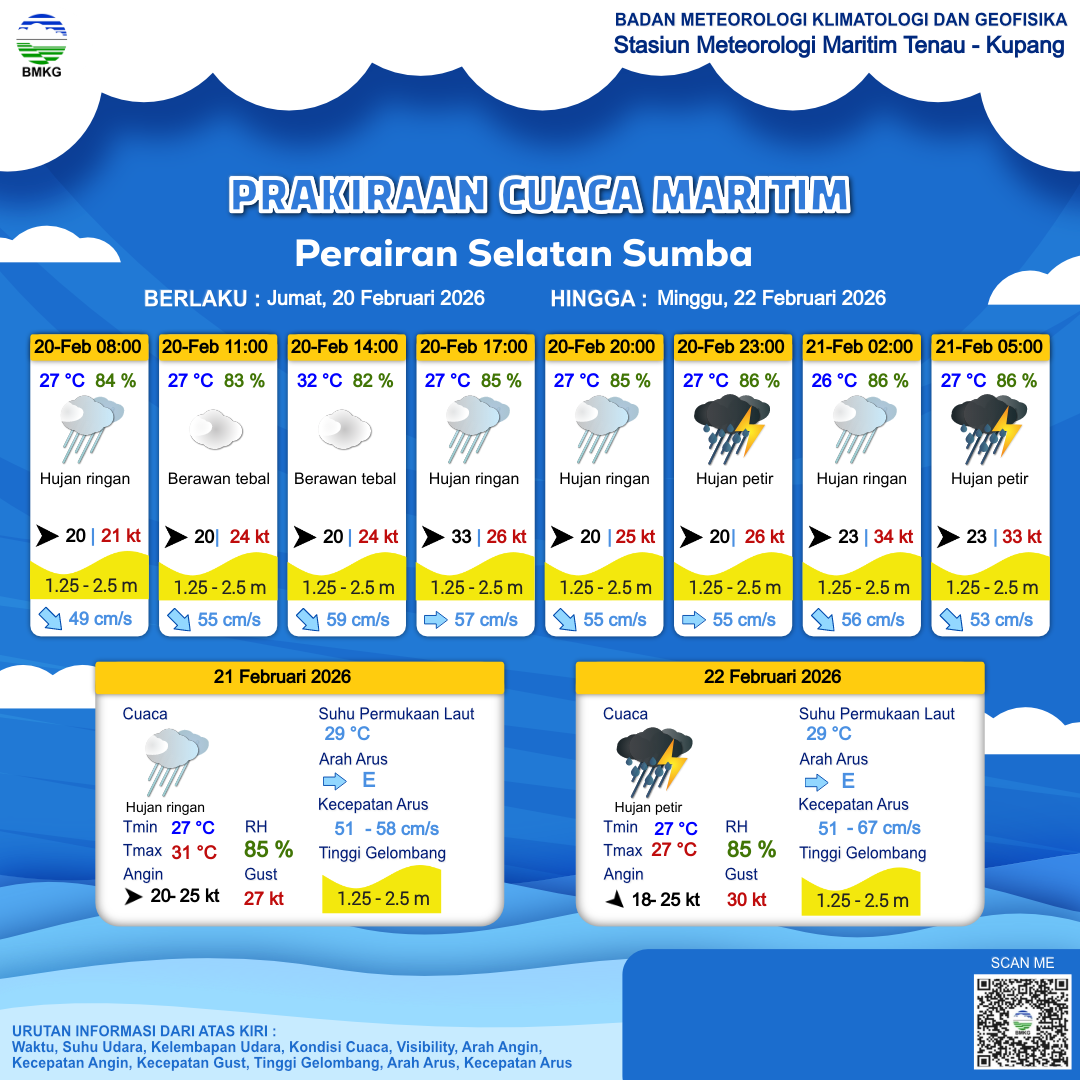 20 Feb 26, 11.00 9 jam kedepan | Barat 20 kt Gust Peningkatan kecepatan angin yang singkat dan tiba-tiba : 25 kt | 2.2 m Sedang | Timur 56.0 cm/s | 27 °C | 85 % | |