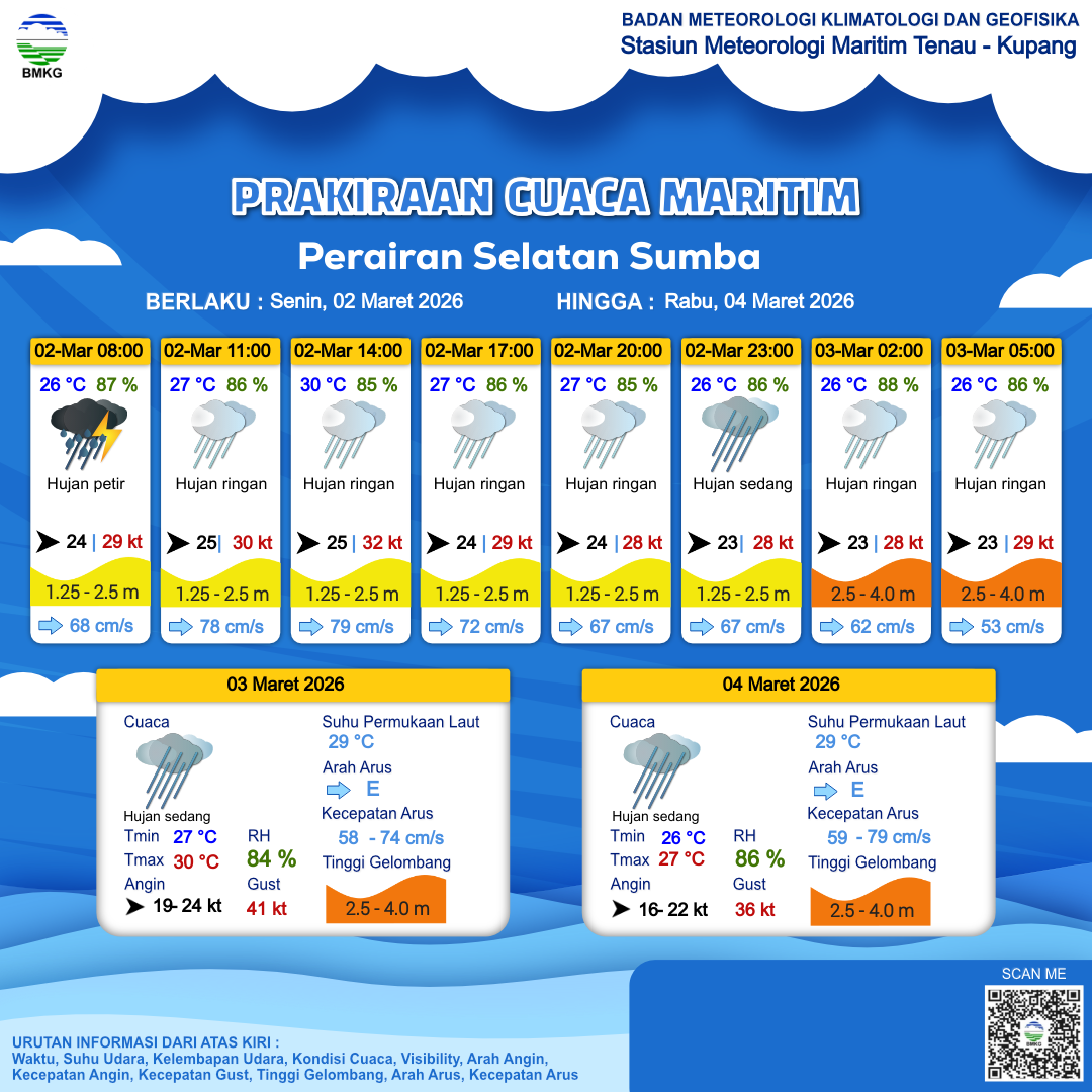 2 Mar 26, 06.00 2 jam kedepan | Barat 25 kt Gust Peningkatan kecepatan angin yang singkat dan tiba-tiba : 32 kt | 2.3 m Sedang | Timur 79.0 cm/s | 30 °C | 85 % | |