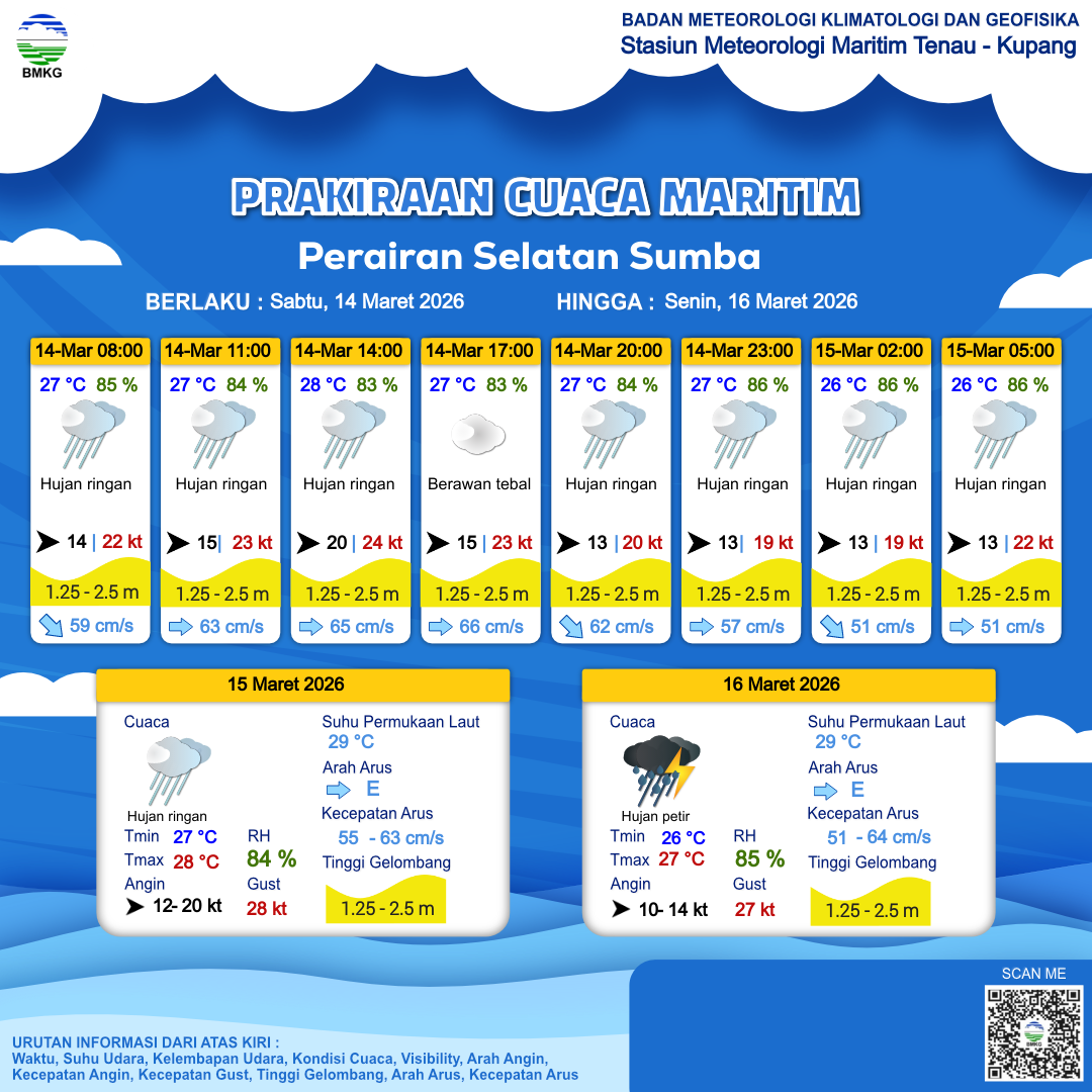 14 Mar 26, 20.00 3 jam kedepan | Barat 13 kt Gust Peningkatan kecepatan angin yang singkat dan tiba-tiba : 22 kt | 2.1 m Sedang | Timur 51.0 cm/s | 26 °C | 86 % | |