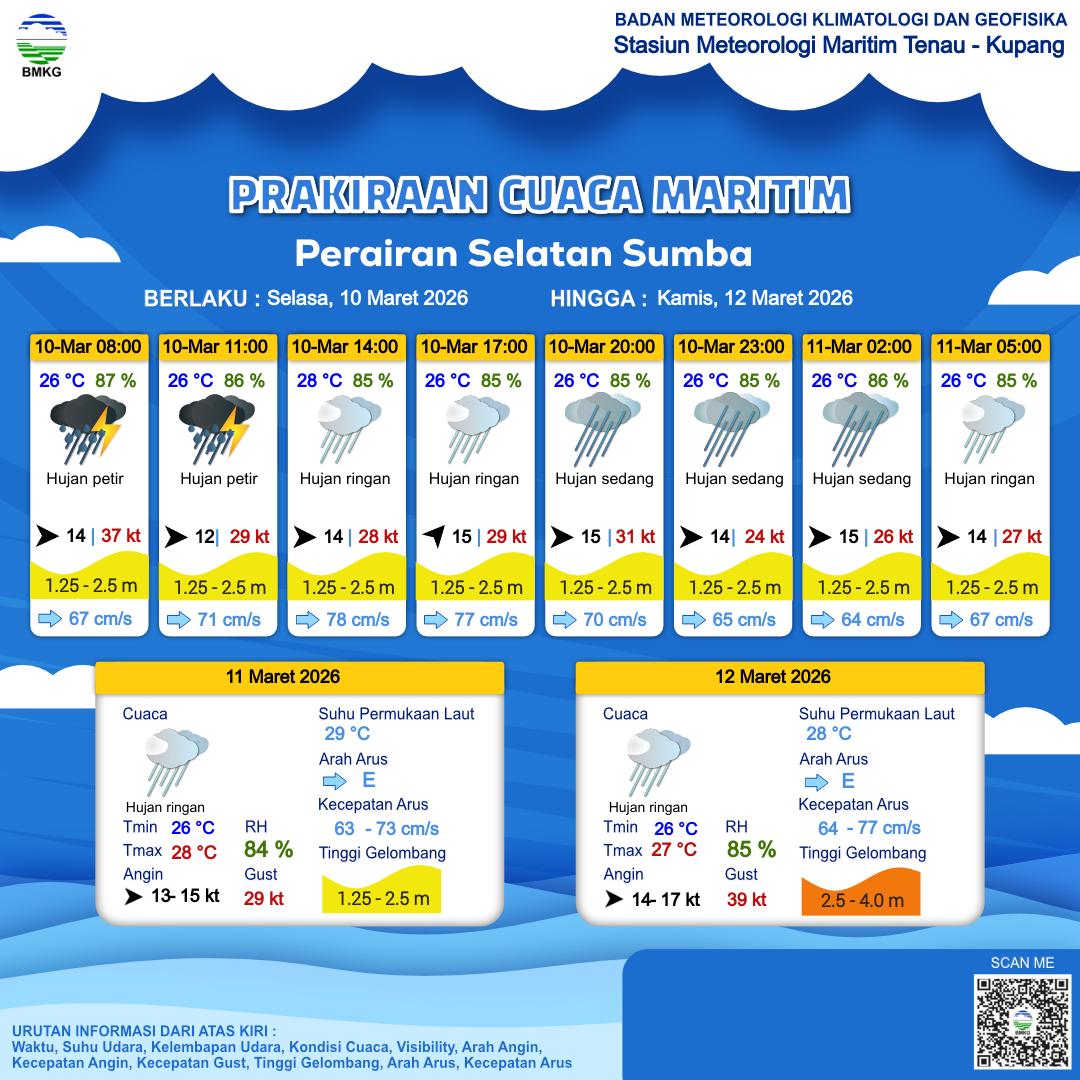 10 Mar 26, 05.00 3 jam kedepan | Barat 14 kt Gust Peningkatan kecepatan angin yang singkat dan tiba-tiba : 33 kt | 2.5 m Tinggi | Timur 76.0 cm/s | 28 °C | 86 % | |