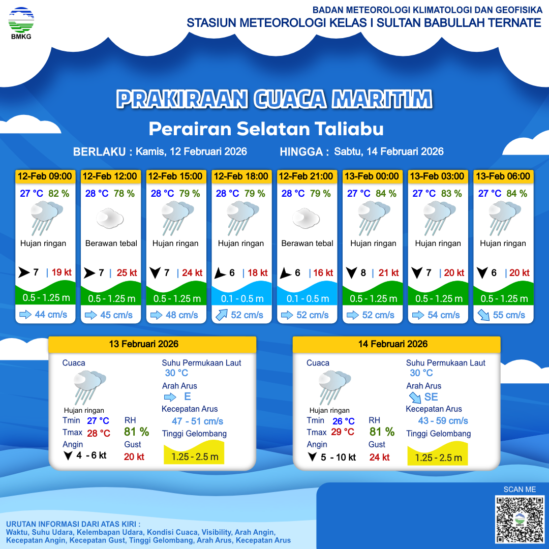 12 Feb 26, 14.00 4 jam kedepan | Utara 8 kt Gust Peningkatan kecepatan angin yang singkat dan tiba-tiba : 19 kt | 0.4 m Tenang | Timur 53.0 cm/s | 28 °C | 81 % | |