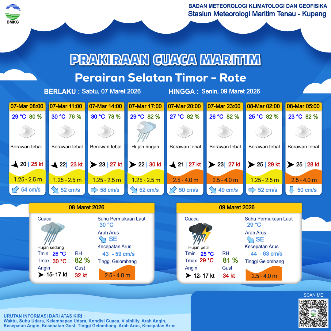 7 Mar 26, 07.00 9 jam kedepan | Barat 25 kt Gust Peningkatan kecepatan angin yang singkat dan tiba-tiba : 42 kt | 2.4 m Sedang | Timur 57.0 cm/s | 29 °C | 81 % | |